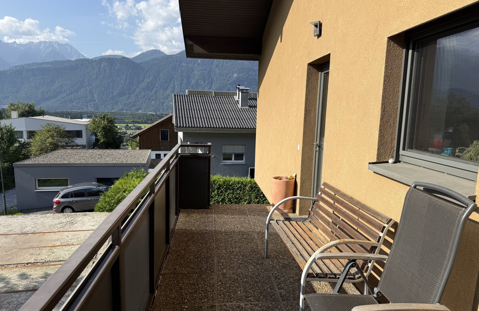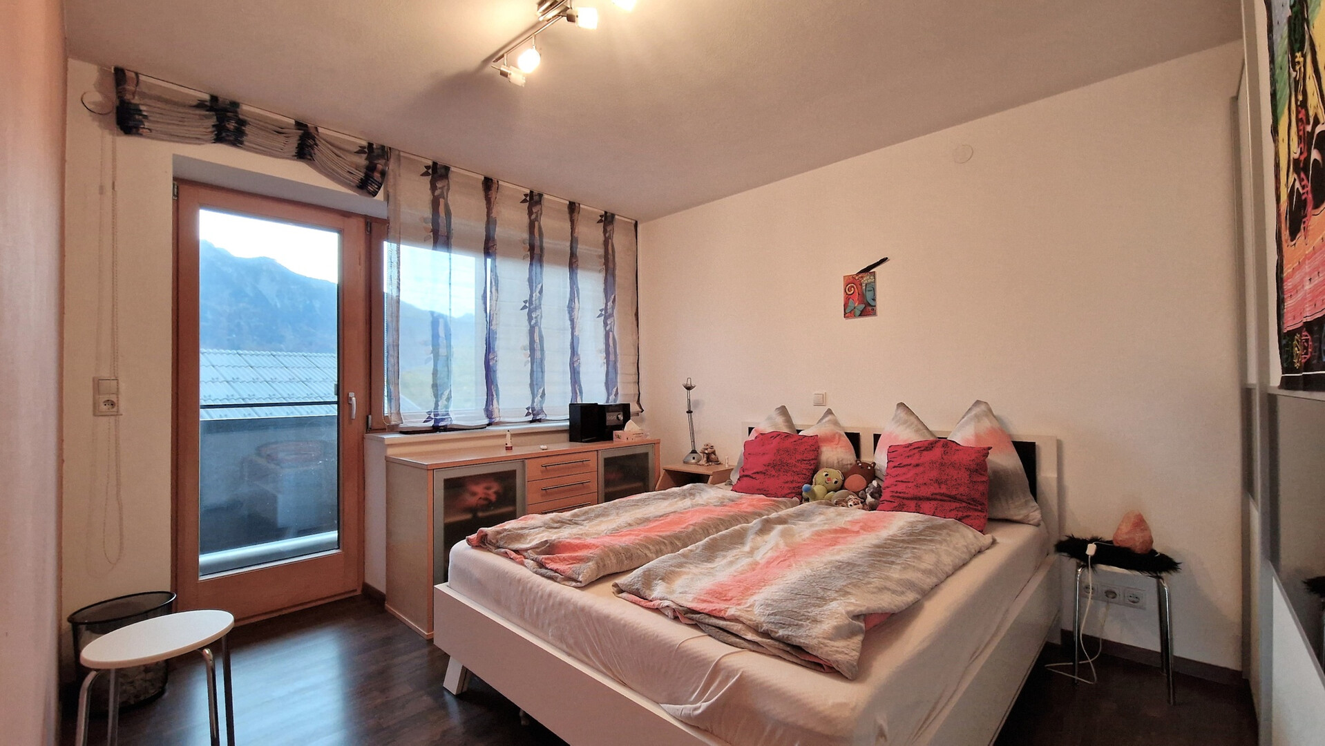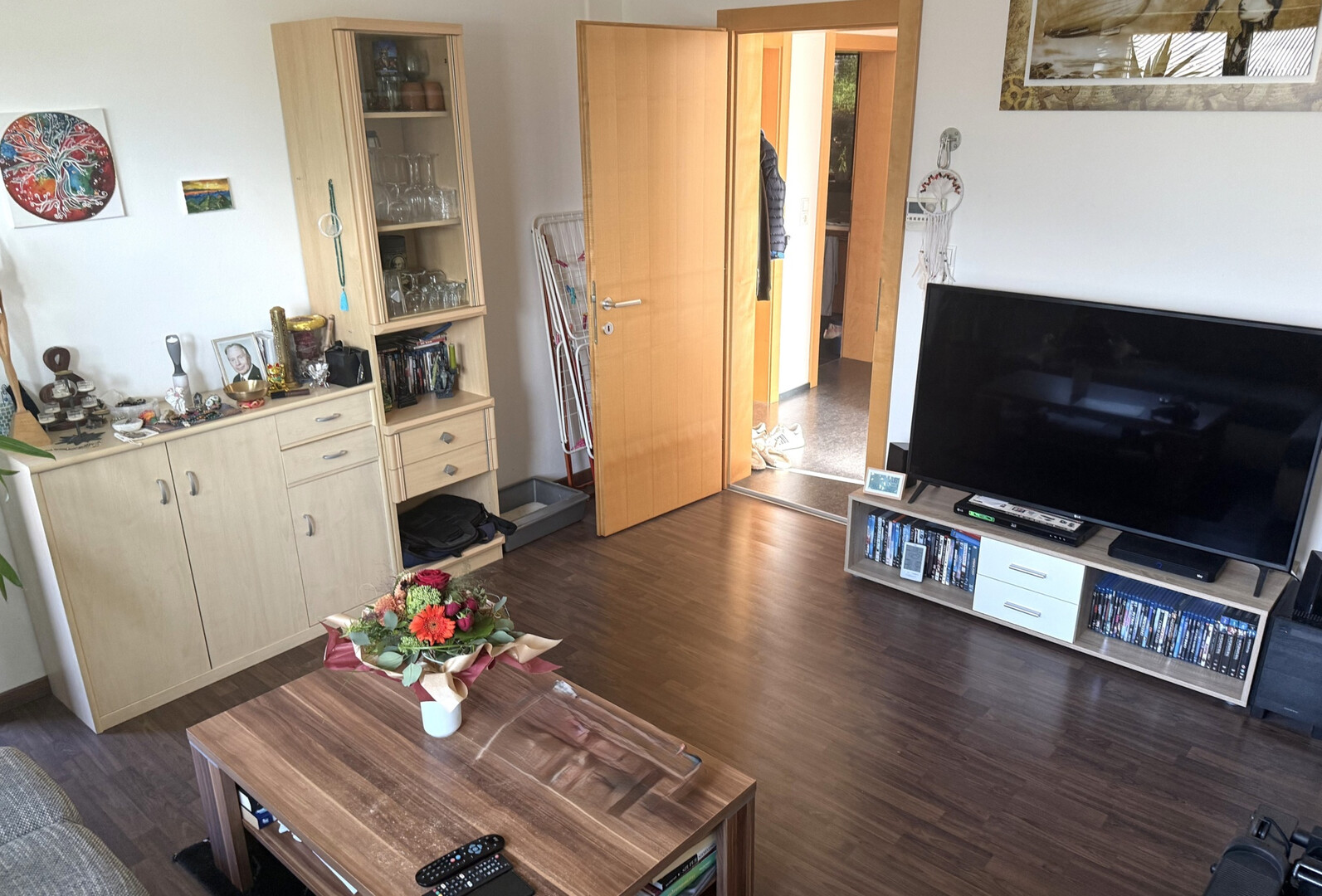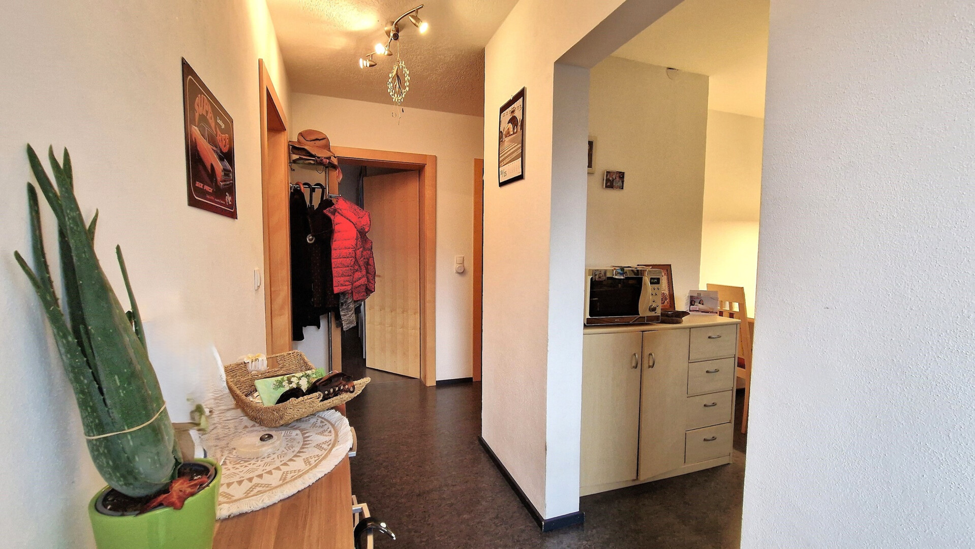 Über das erhöhte Erdgeschoss gelangt man in den Eingangsbereich, von dem aus über einen Vorraum mit Garderobe die Küche, das Wohnzimmer, ein Schlafzimmer sowie das Badezimmer und ein Abstellraum erschlossen sind. Vom Wohn- und Schlafzimmer gelangt man auf den Aussichtsbalkon.