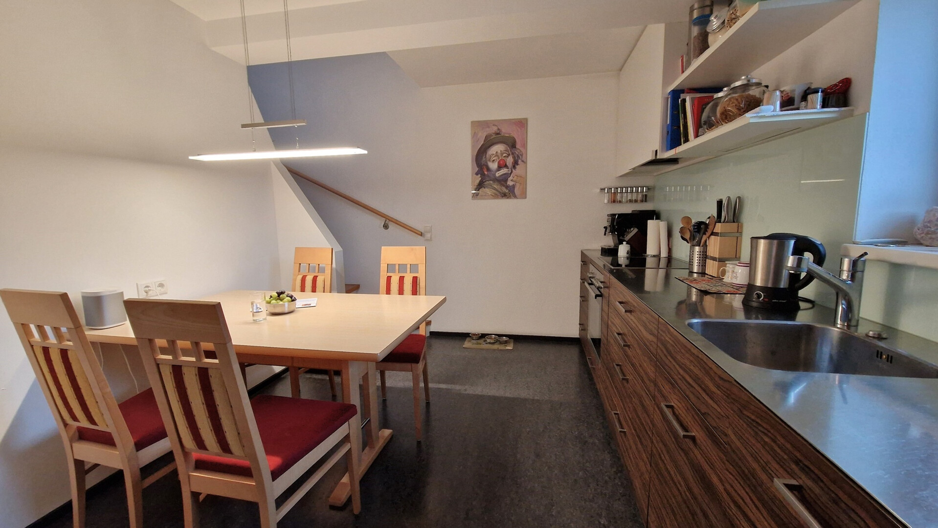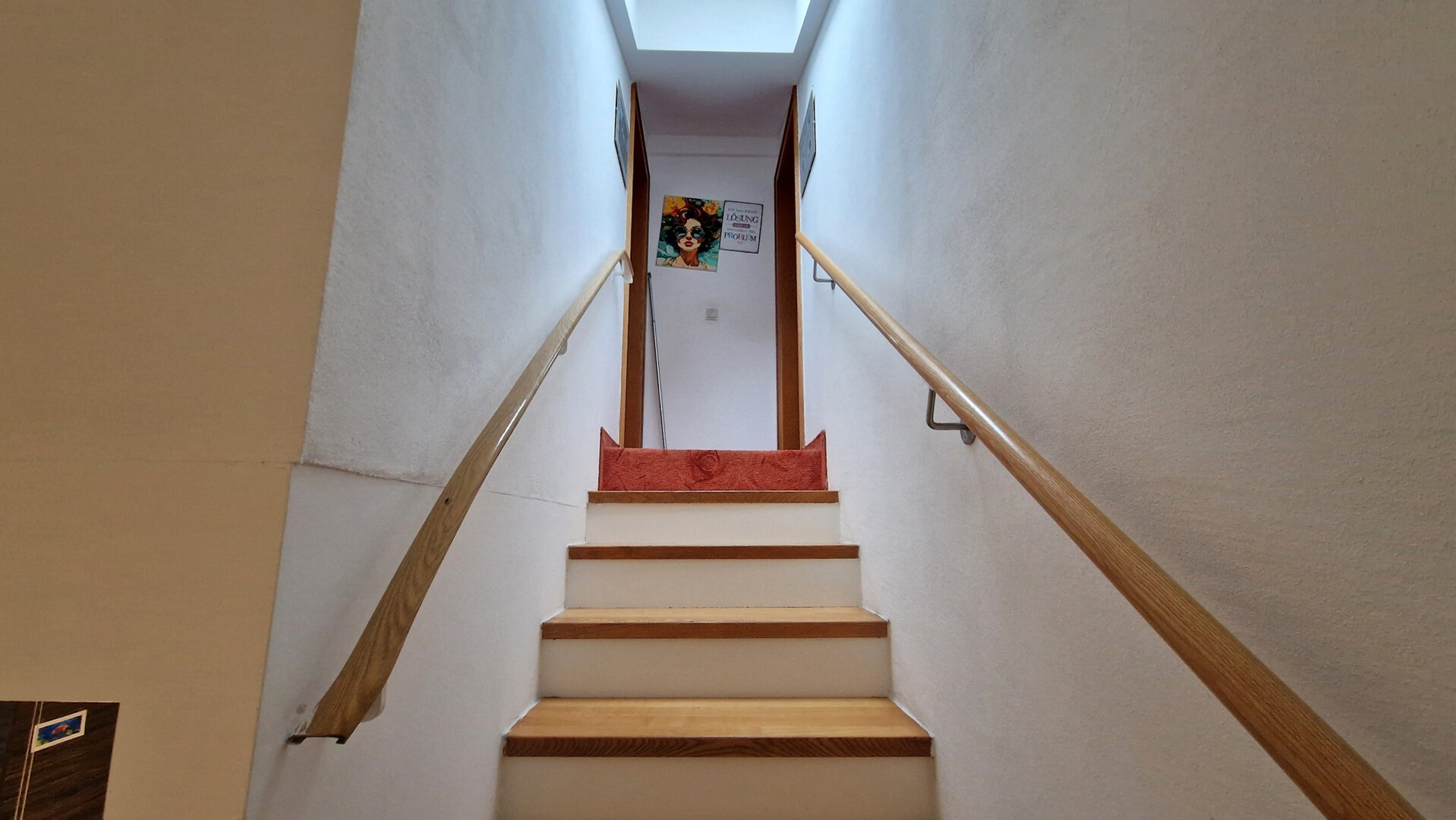 Von der Küche führt die Treppe ins Dachgeschoss, wo sich zwei gemütliche Kinderzimmer und weitere Lagermöglichkeiten befinden.