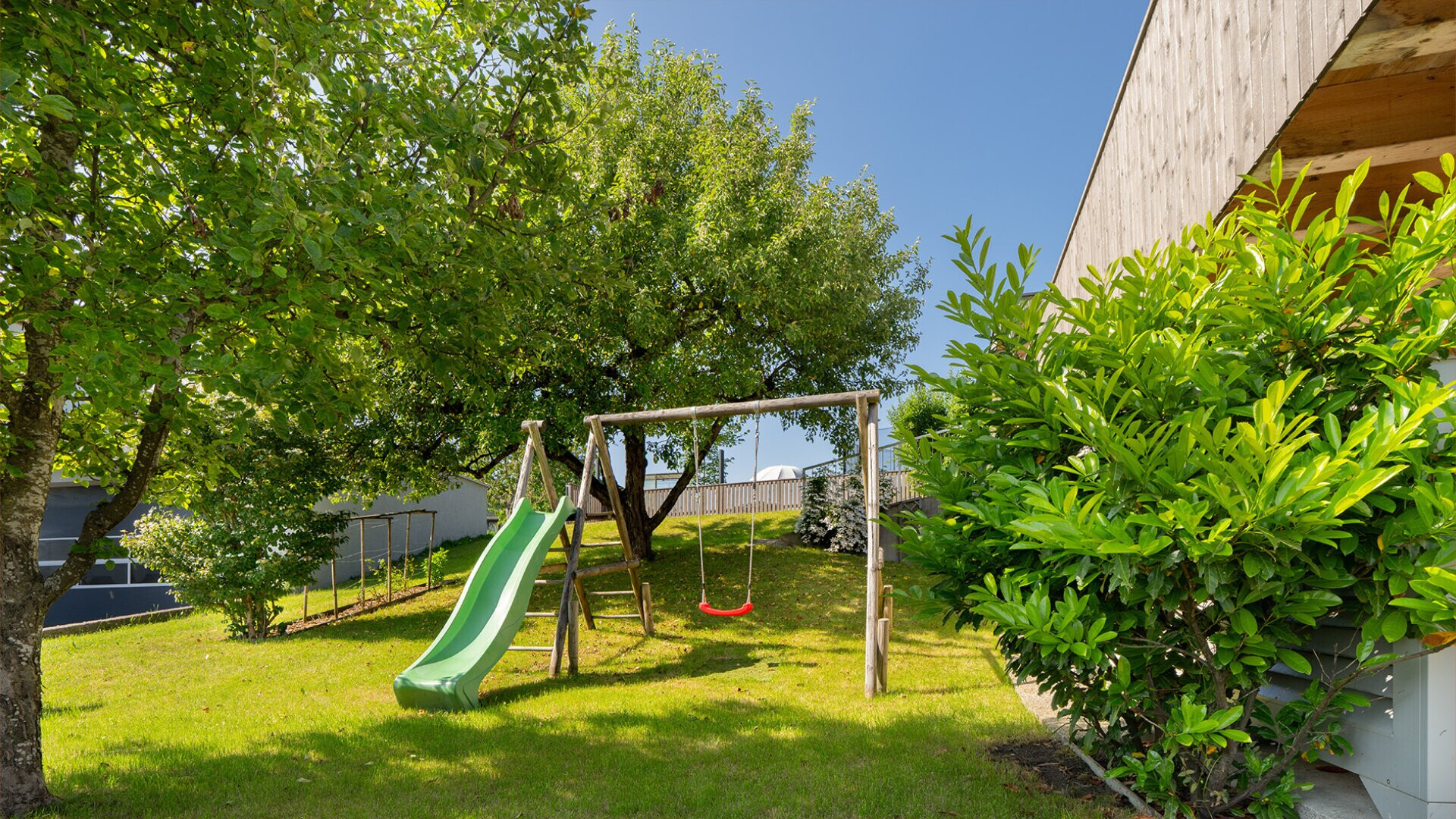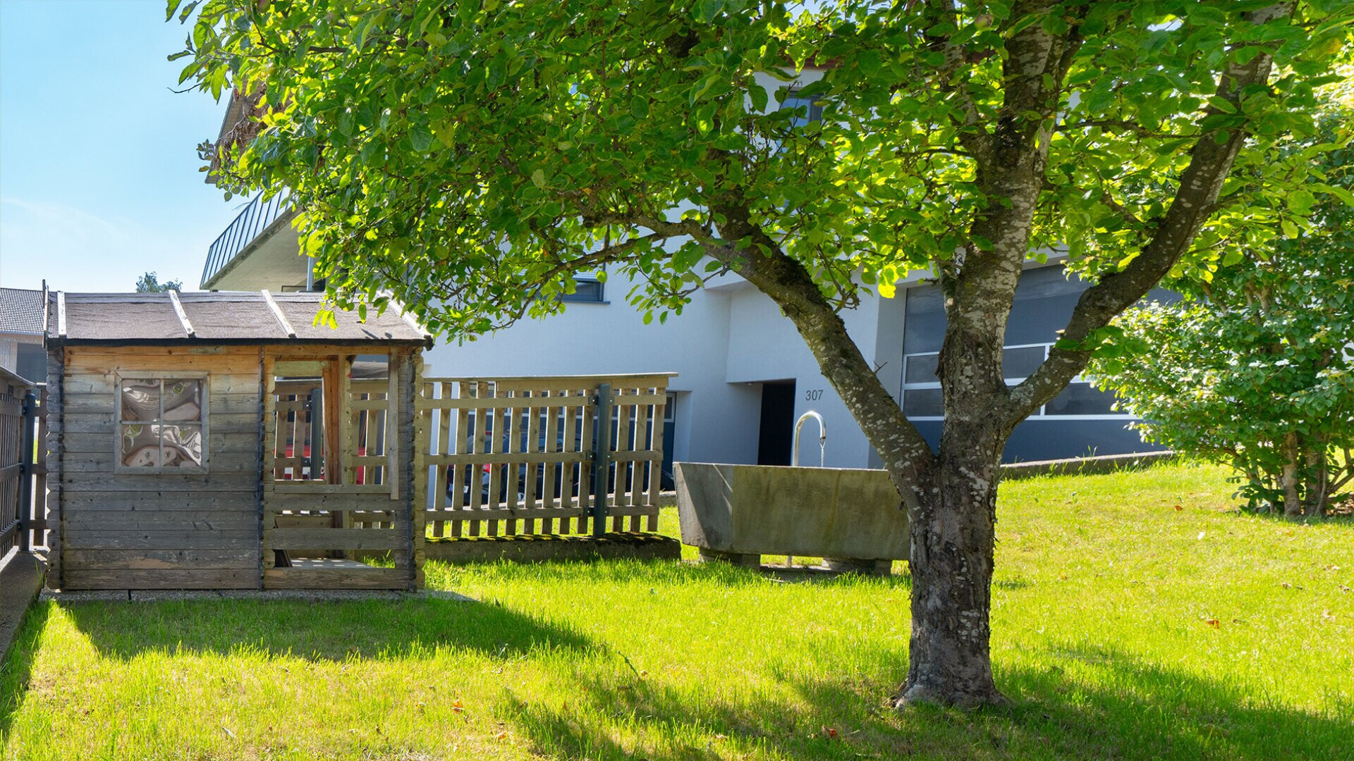 In der Fassade verbirgt sich eine praktische Nische zur Aufbewahrung von Gartenpolstern. Der befestigte Platz im Garten ist ideal für einen Aufstellpool. Außenwasseranschluss, Regenwasserspeicher (7–8 m³) und Gardena-Schlauchsystem sind vorhanden. Zwei Apfelbäume laden zum Klettern und perfektem Hängemattenschaukeln ein.