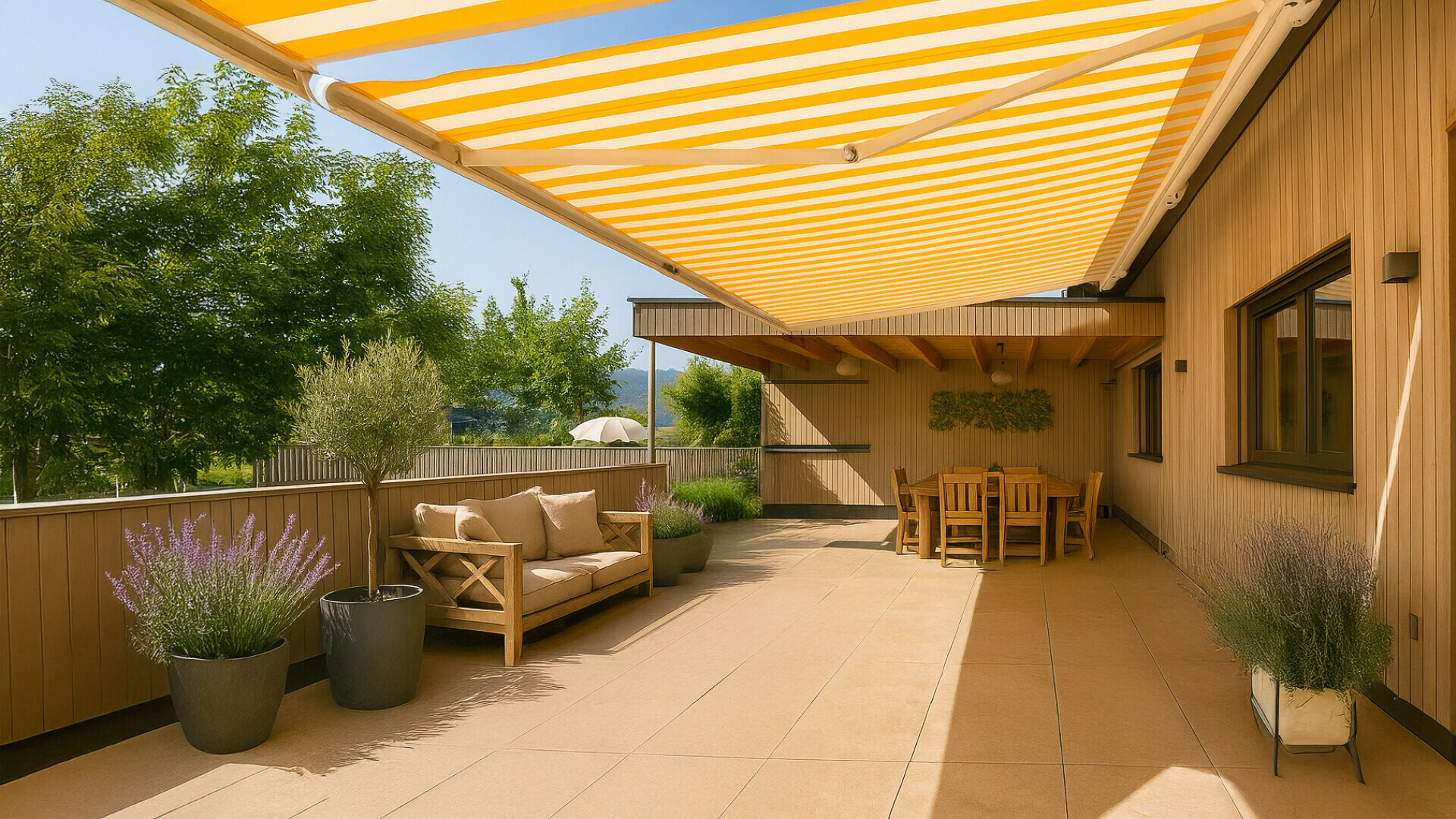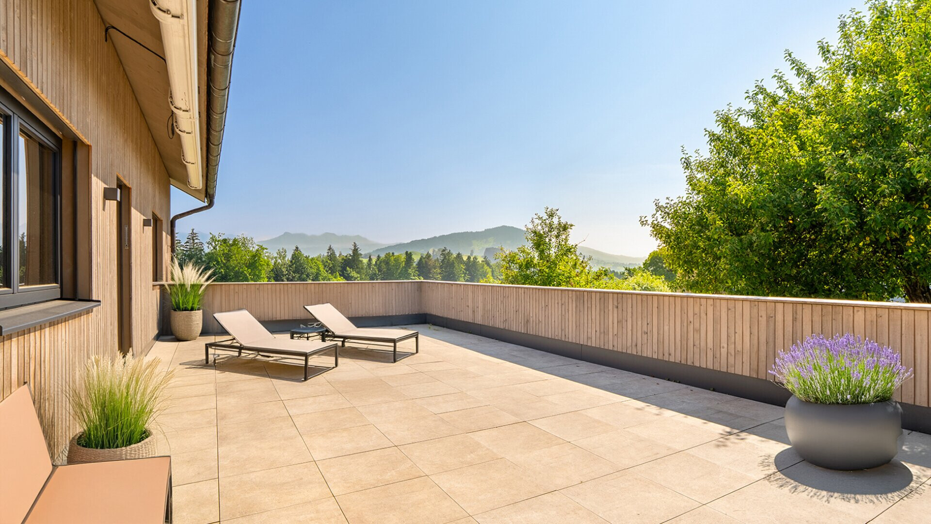 Ein Highlight ist die großzügige Terrasse mit pflegeleichtem Feinsteinbelag, elektrischer Außenbeleuchtung, Musikanschluss und zwei Markisen mit je 4 m Spannweite.
