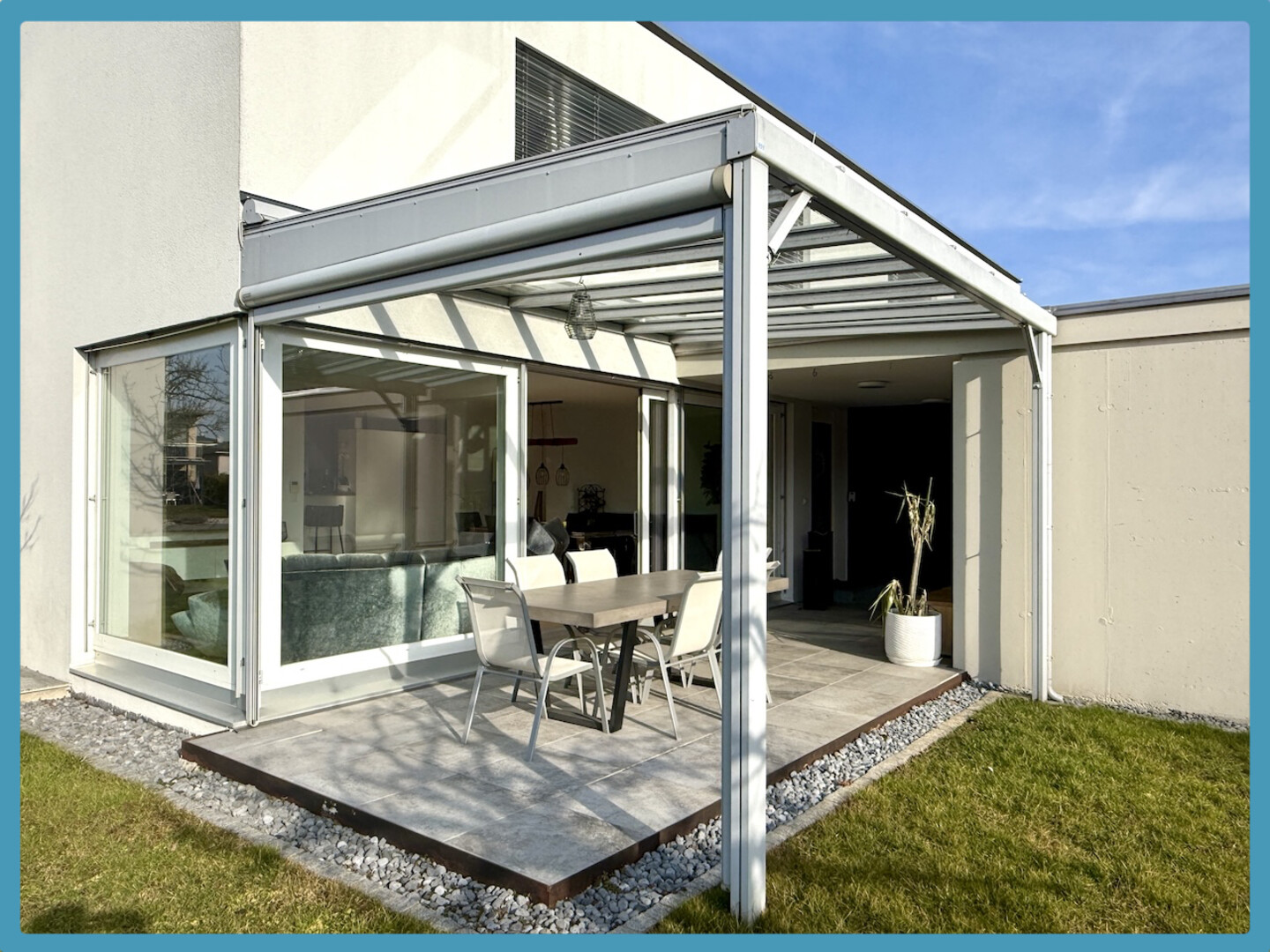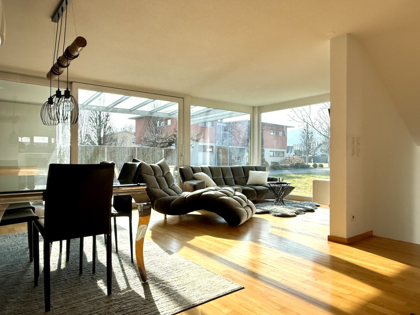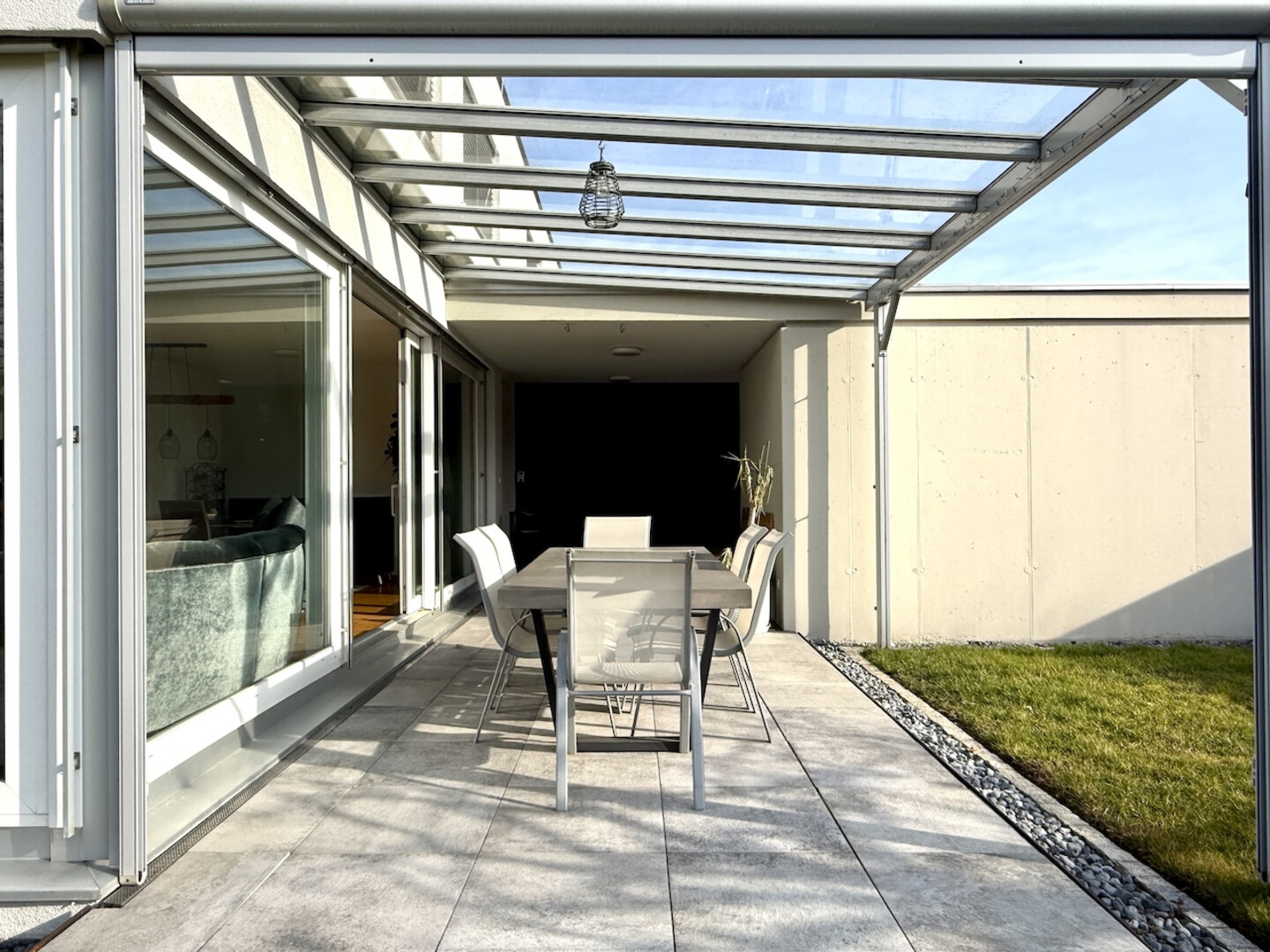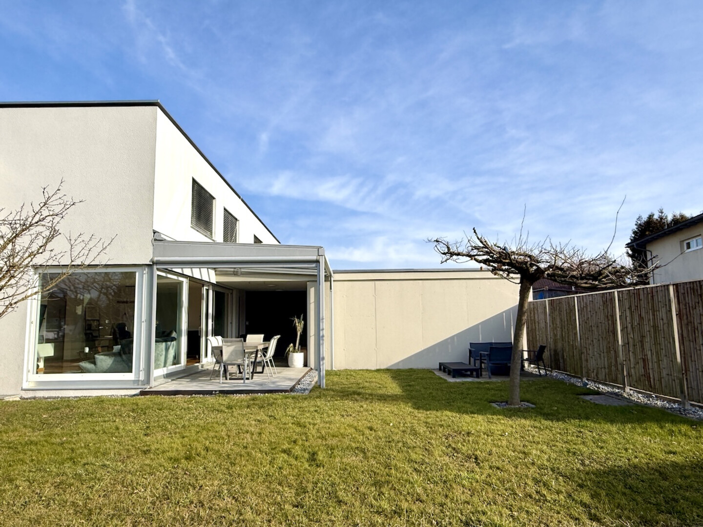 Im Erdgeschoss befinden sich ein großes Wohnzimmer/Esszimmer mit Zugang auf die große überdachte Terrasse mit elektrischer Beschattung (ca. 24,00 m²) sowie den gepflegten Garten mit zusätzlichem Sitz- und Grillplatz, Küche mit gut ausgestatteter Einbauküche und Speis, Gang, WC.