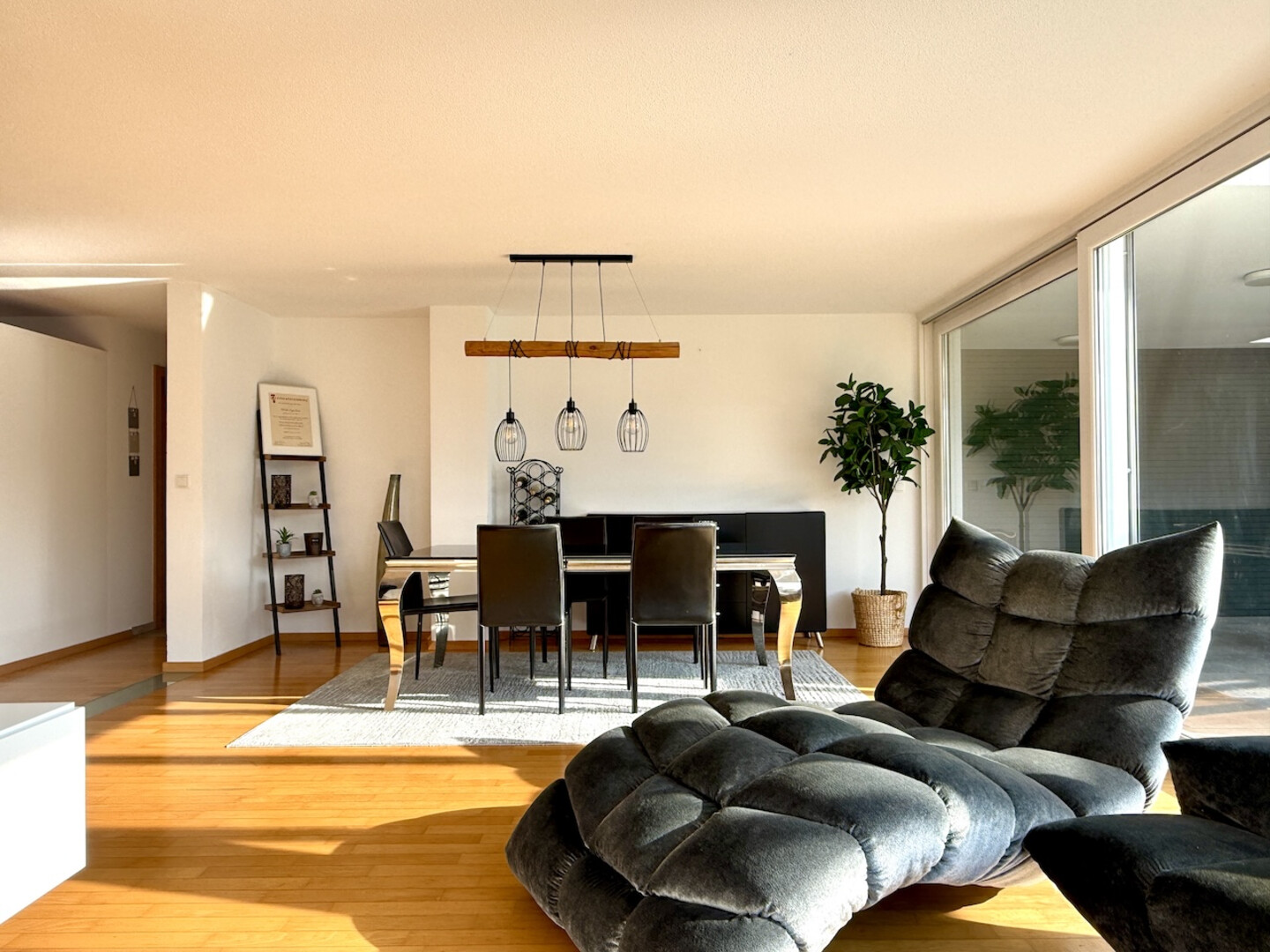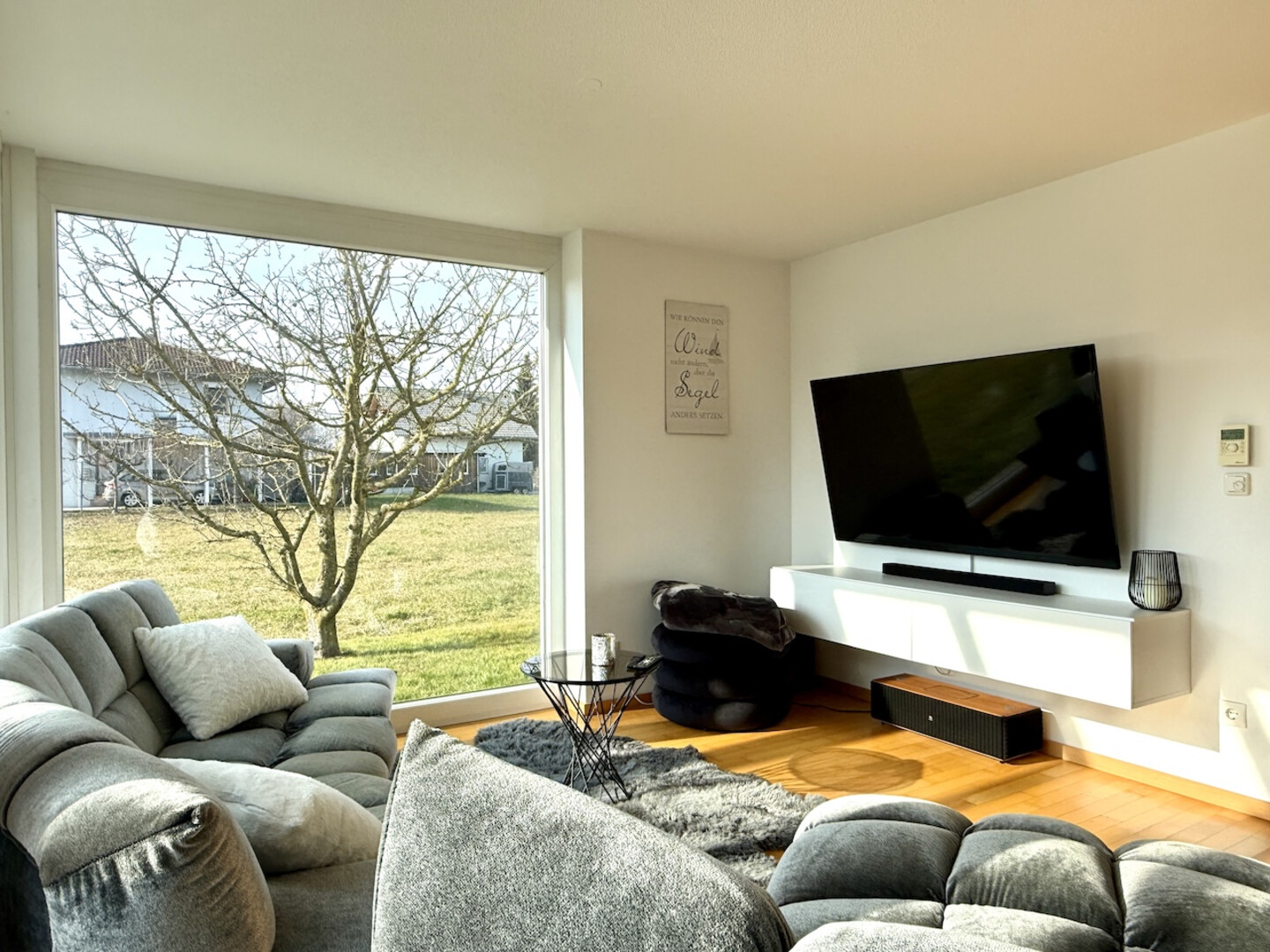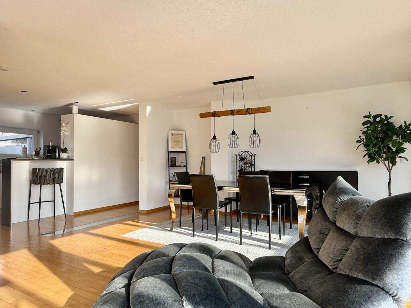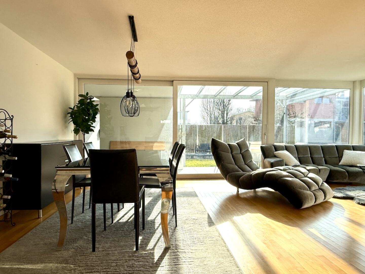 Im Erdgeschoss befinden sich ein großes Wohnzimmer/Esszimmer mit Zugang auf die große überdachte Terrasse mit elektrischer Beschattung (ca. 24,00 m²) sowie den gepflegten Garten mit zusätzlichem Sitz- und Grillplatz, Küche mit gut ausgestatteter Einbauküche und Speis, Gang, WC.