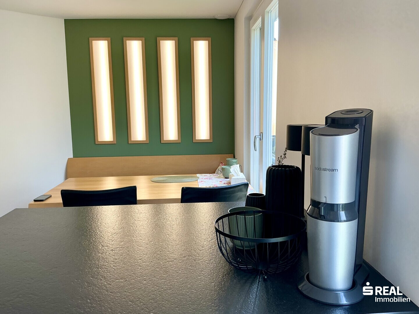 - Erdgeschoss: Schieferboden (2022) mit Elektrofußbodenheizung (Schlüter), Einbauküche (7/2022 - Einbaubackofen, Dampfgarer, Kochfeld, Dunstabzug nach Außen, Geschirrspüler, Kühlschrank mit 3 Gefrierfächern, Kücheninsel, Tisch mit Bank + 4 Stühlen, 2 Lautsprecher in der Decke; Wohnraum - Einbauschrank, Schwedenofen, Steinwand;