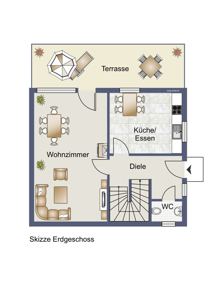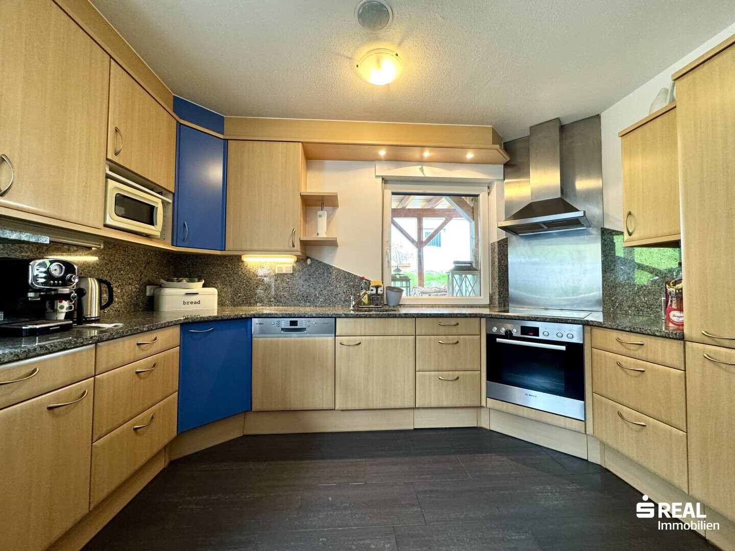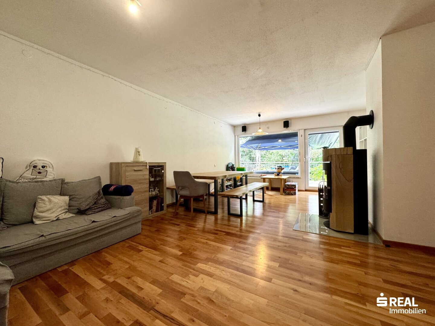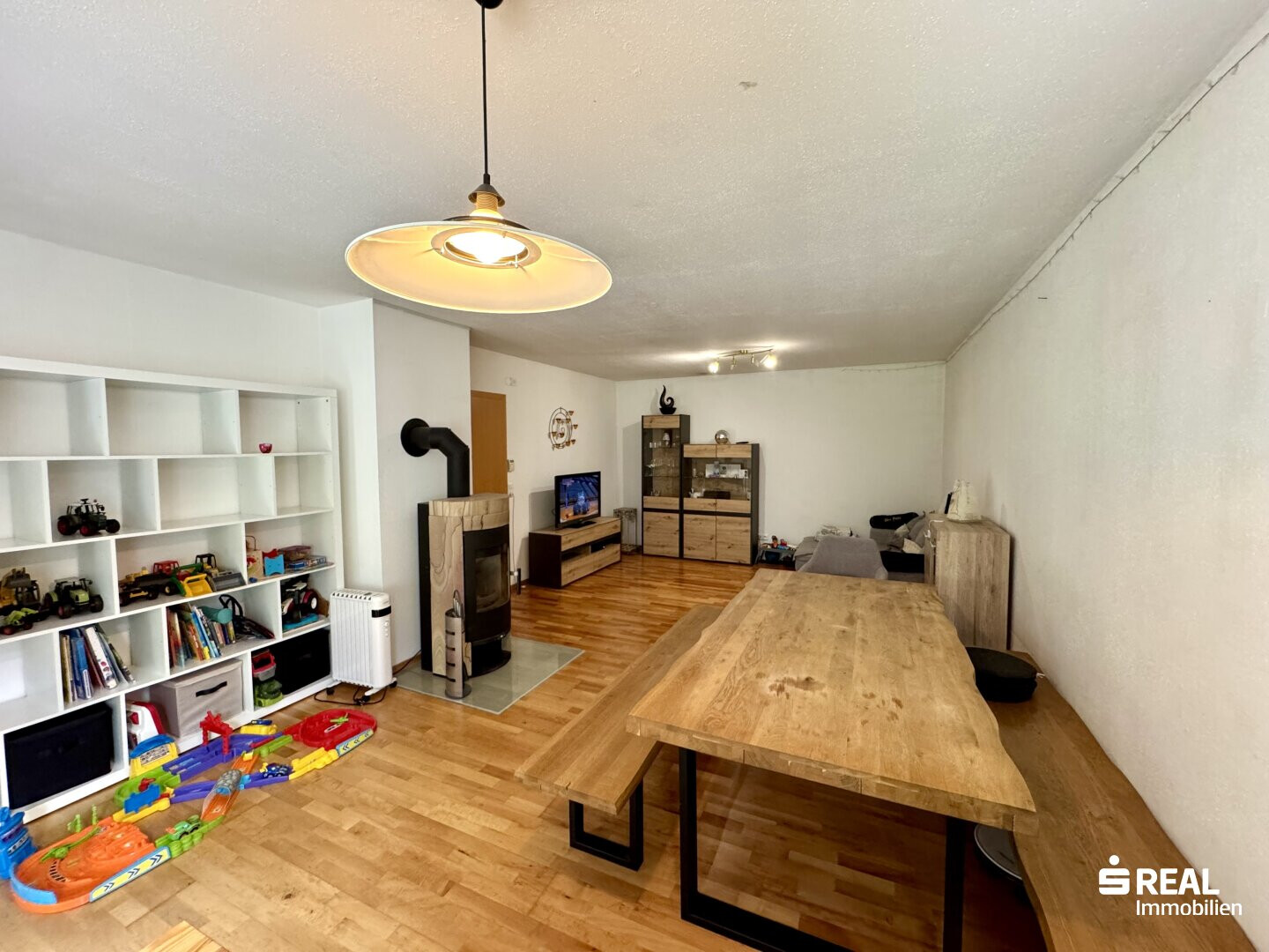 Im Erdgeschoss befinden sich der Eingangsbereich, ein Gäste-WC, die Küche sowie der großzügige und gemütliche Wohn- und Essbereich mit Schwedenofen und Zugang zur Terrasse.