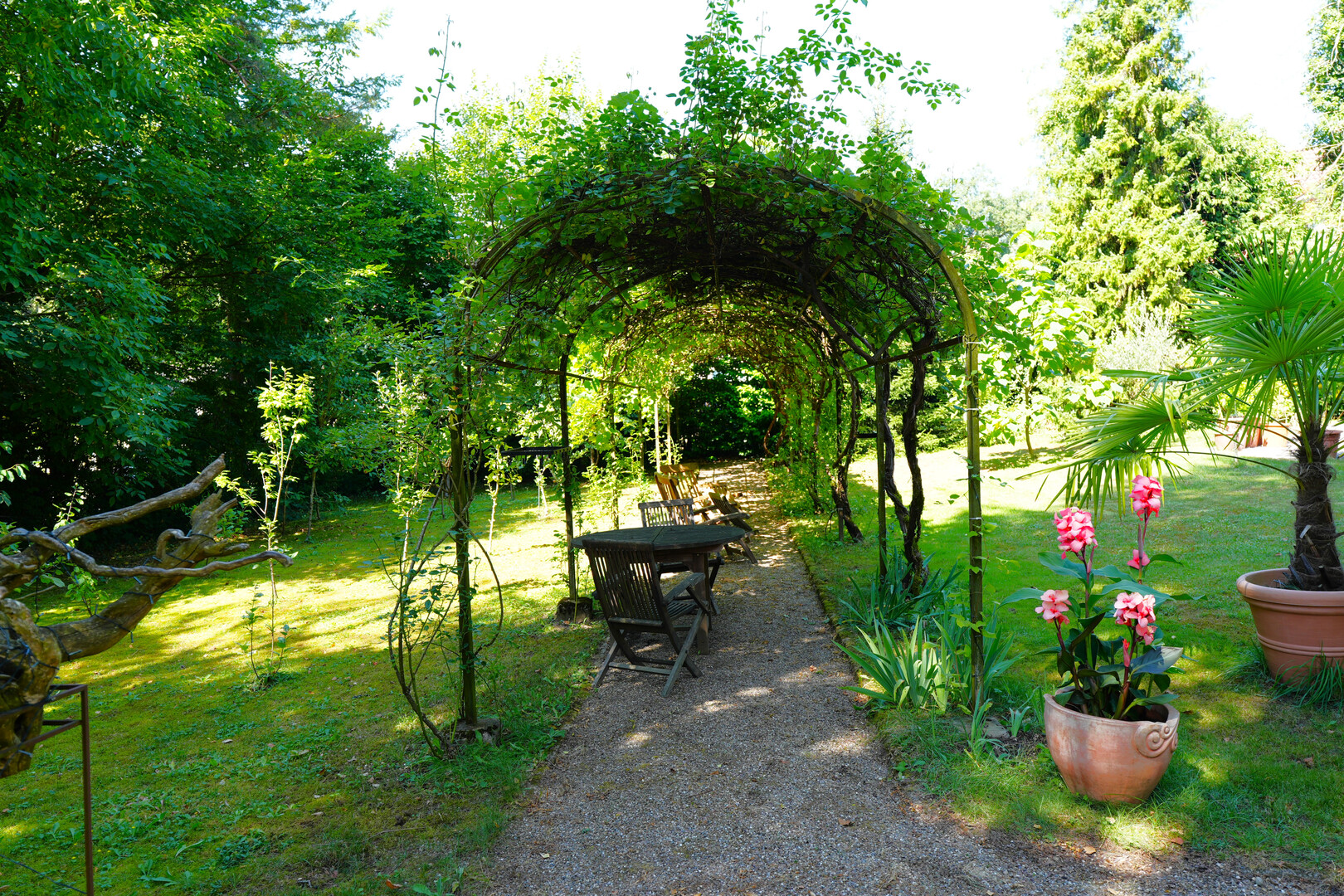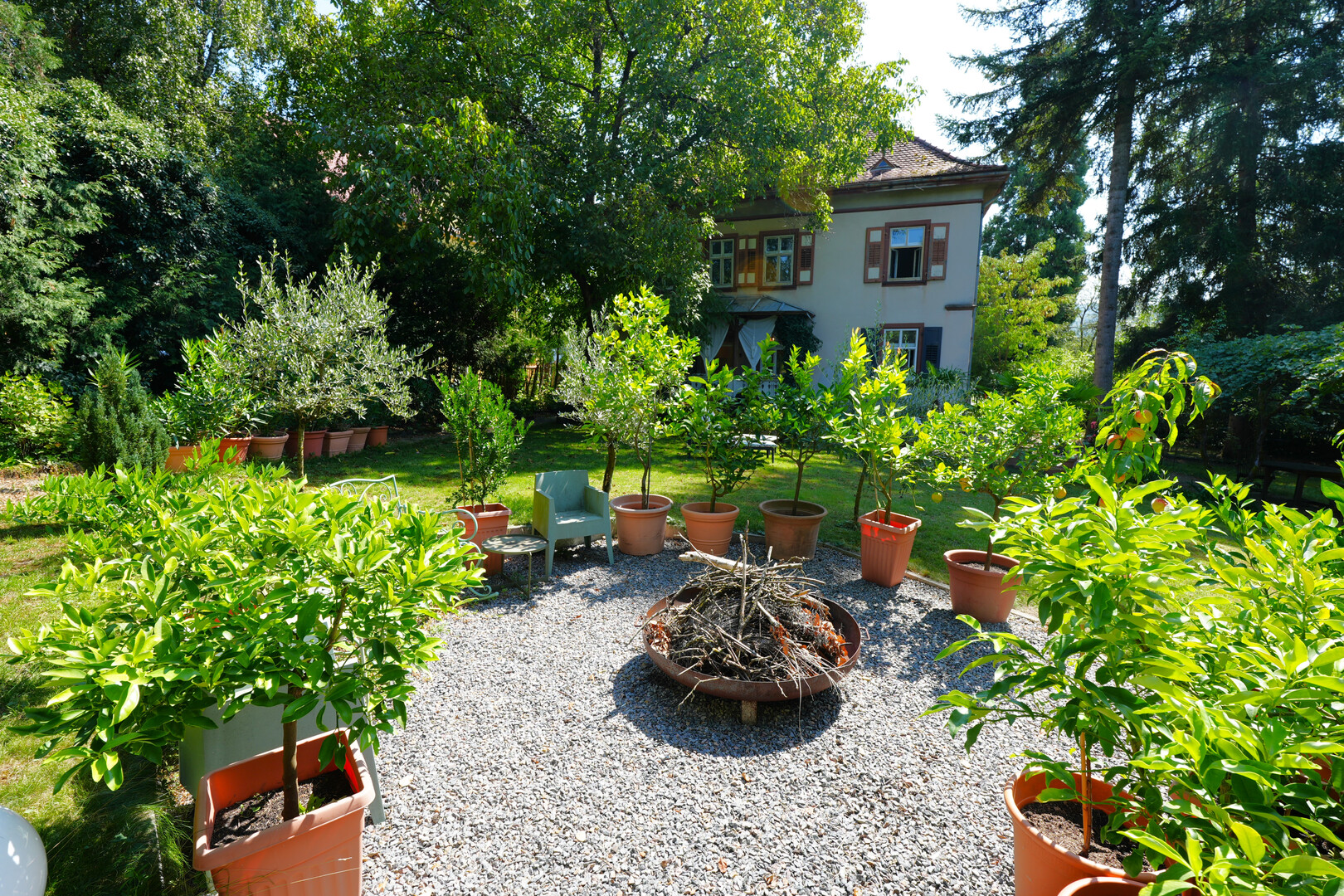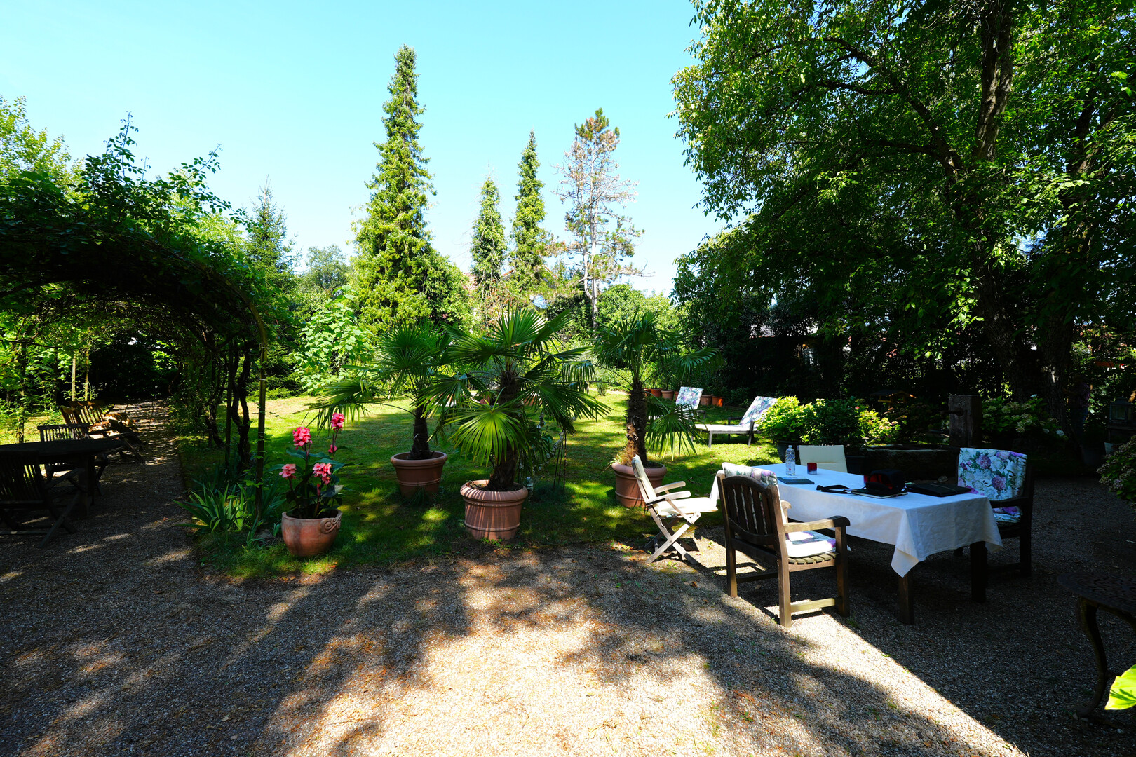 Der grosszügige Garten ist eine wahre Oase der Ruhe. Alte Bäume spenden Schatten, während die liebevoll gestaltete Gartenbereiche zum Entspannen einladen. Ob auf der sonnigen Terrasse, im Grünen unter den Bäumen oder inmitten der mediterranen Pflanzen. Hier geniessen Sie Erholung in privater, geschützter Atmosphäre.