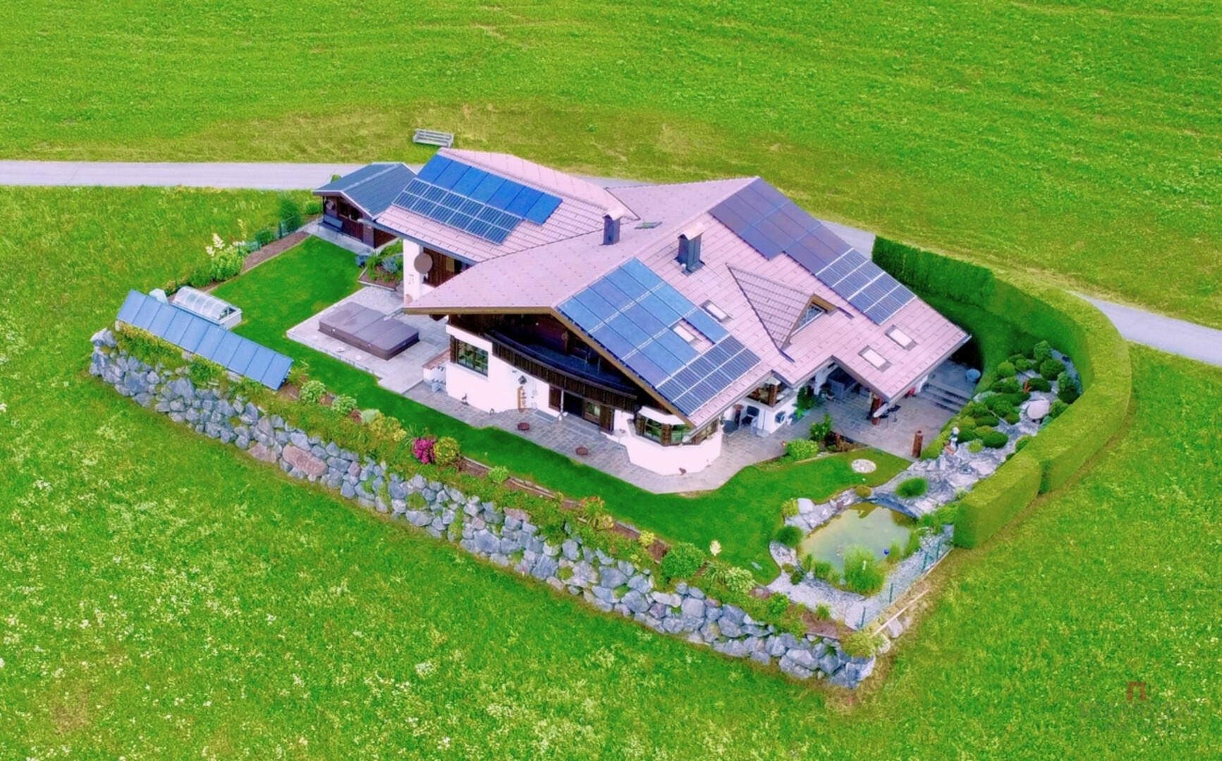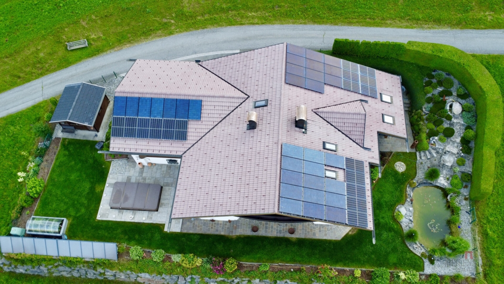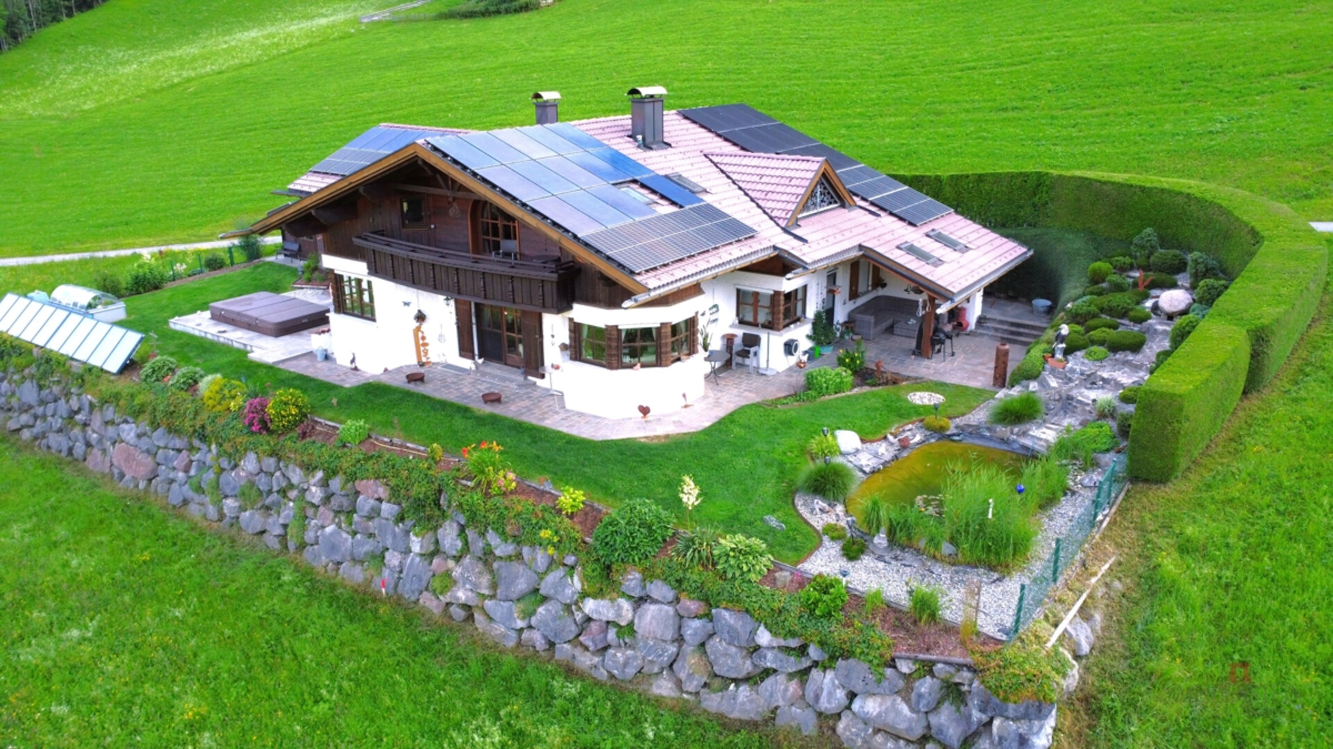 In diesem repräsentativen Einfamilienhaus holt man sich das ganze Jahr den Urlaub in die eigenen vier Wände. Die atemberaubende Außenanlage samt Fischteich bietet Erholung pur.