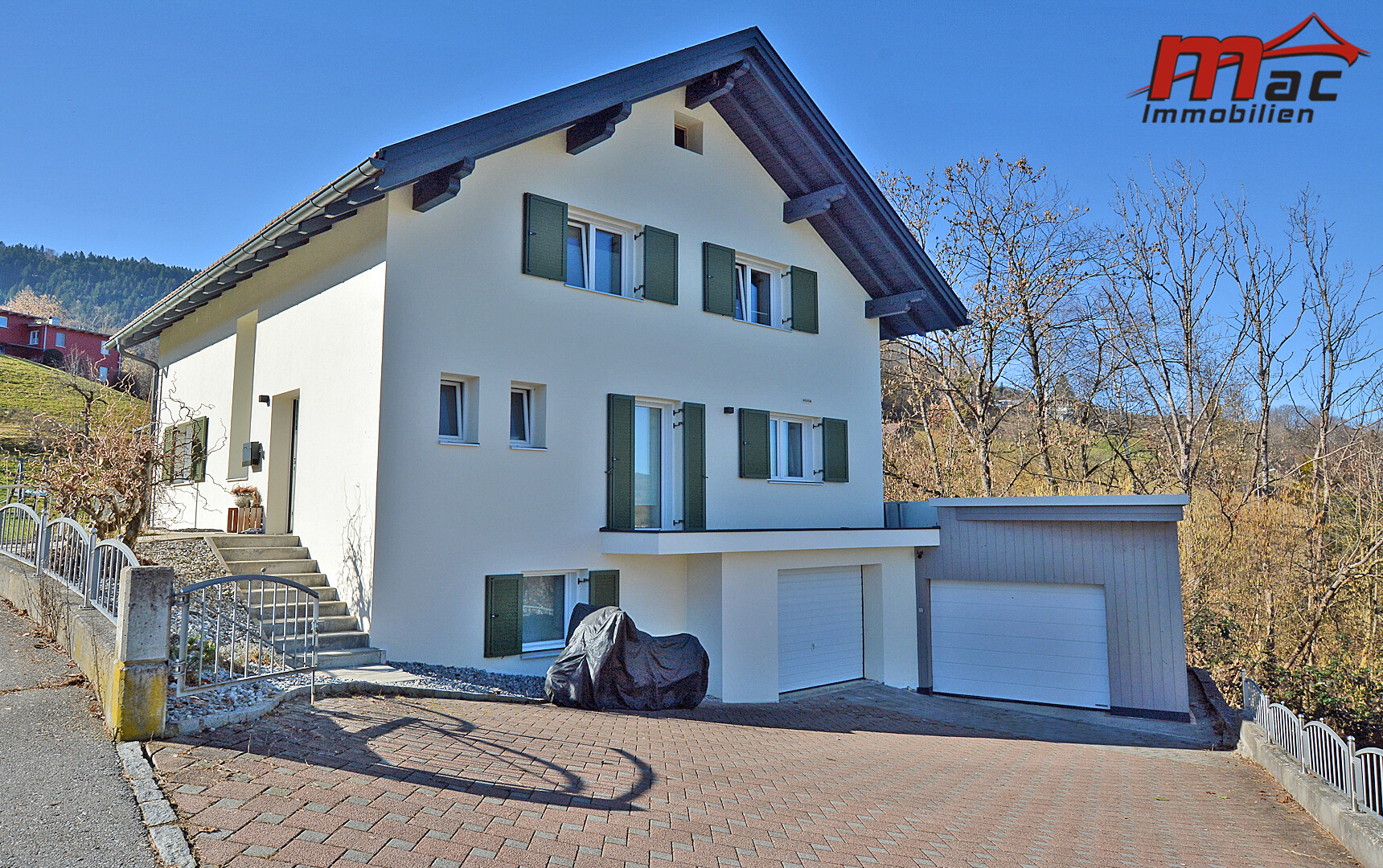 Kunststofffenster mit Dreifachverglasung gewährleisten eine sehr gute Wärmedämmung. Aluminium-Fensterläden, elektrische Rollläden im Wohnzimmer des Untergeschosses sowie Storen sorgen für optimalen Sicht- und Sonnenschutz.