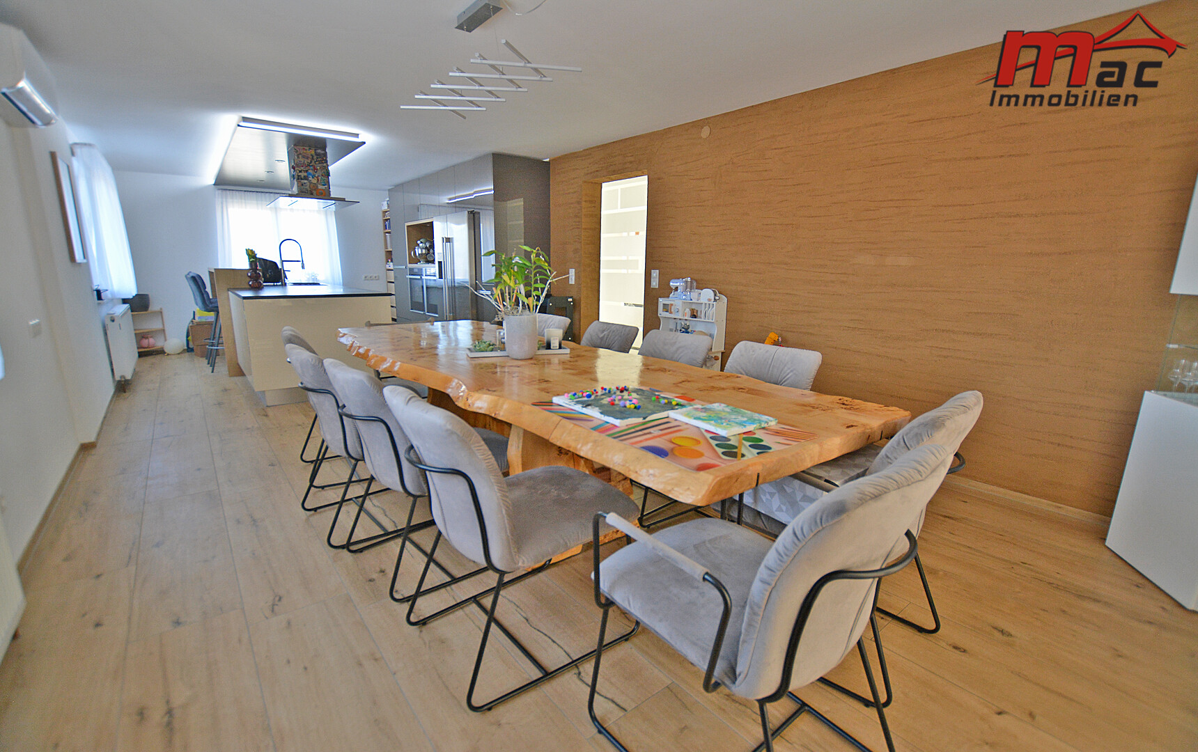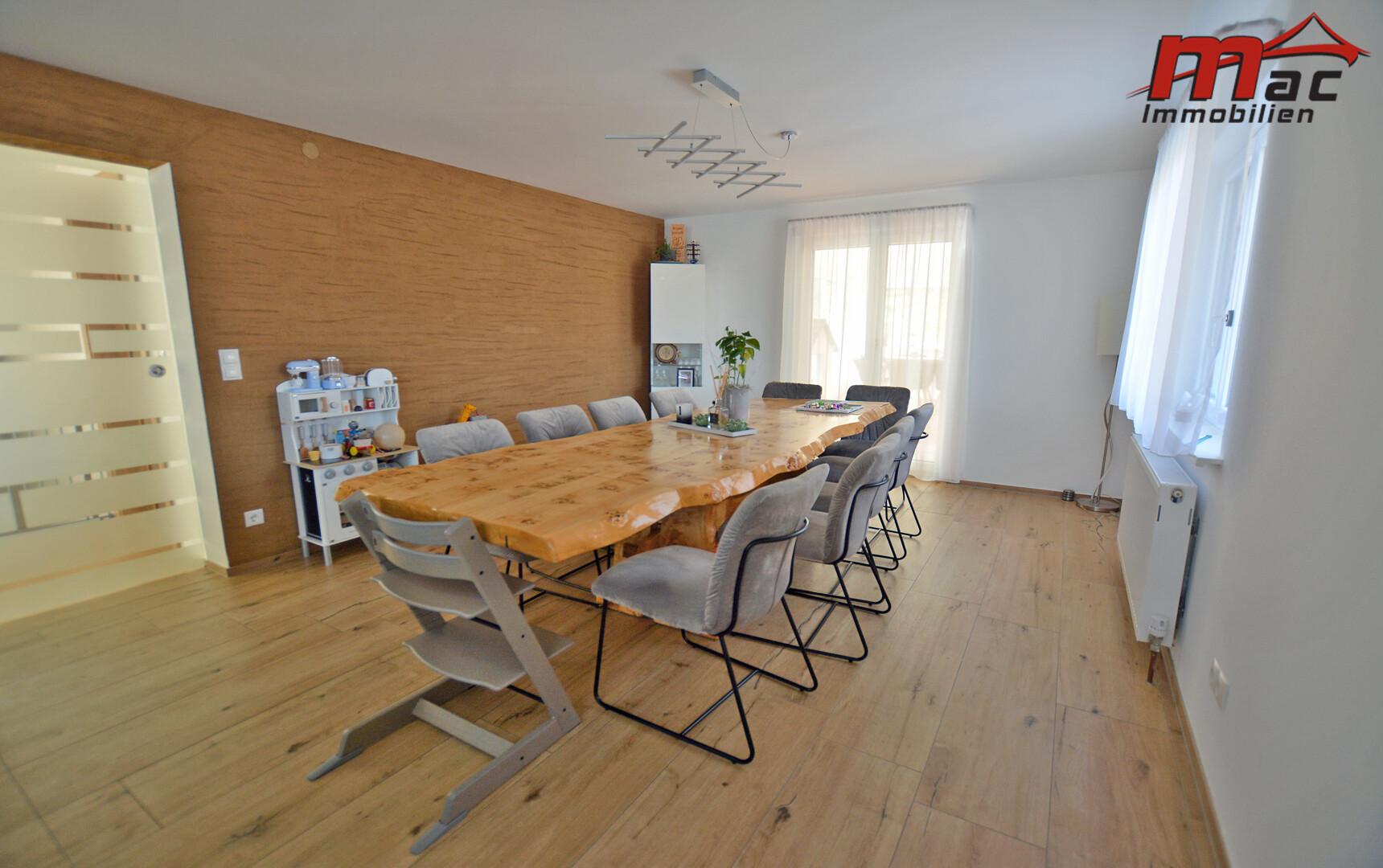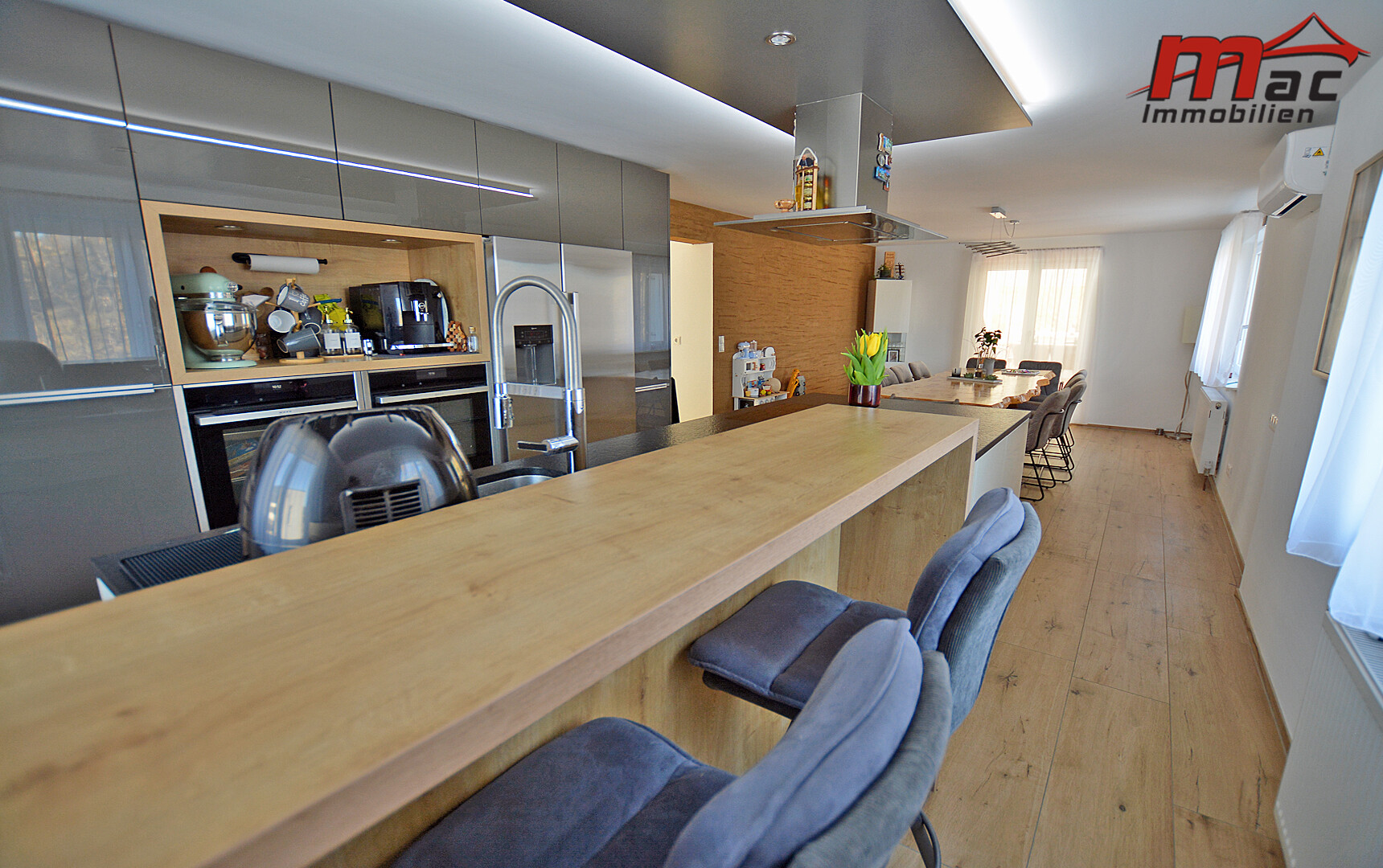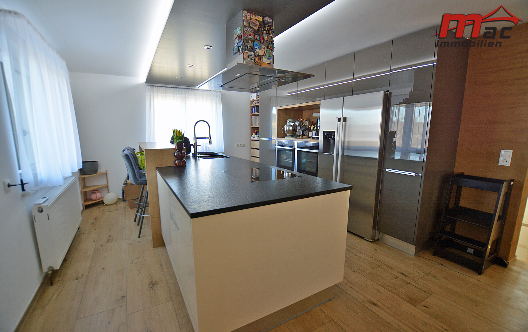 Die moderne Wäger-Küche überzeugt durch hochwertige Materialien und Geräte, darunter ein Induktionsherd, eine edle Granit-Arbeitsplatte sowie eine Kochinsel mit Barhockern. Im Obergeschoss sind bereits Anschlüsse für eine weitere Küche vorgesehen, was die flexible Nutzung als Zweiparteienhaus zusätzlich unterstreicht.