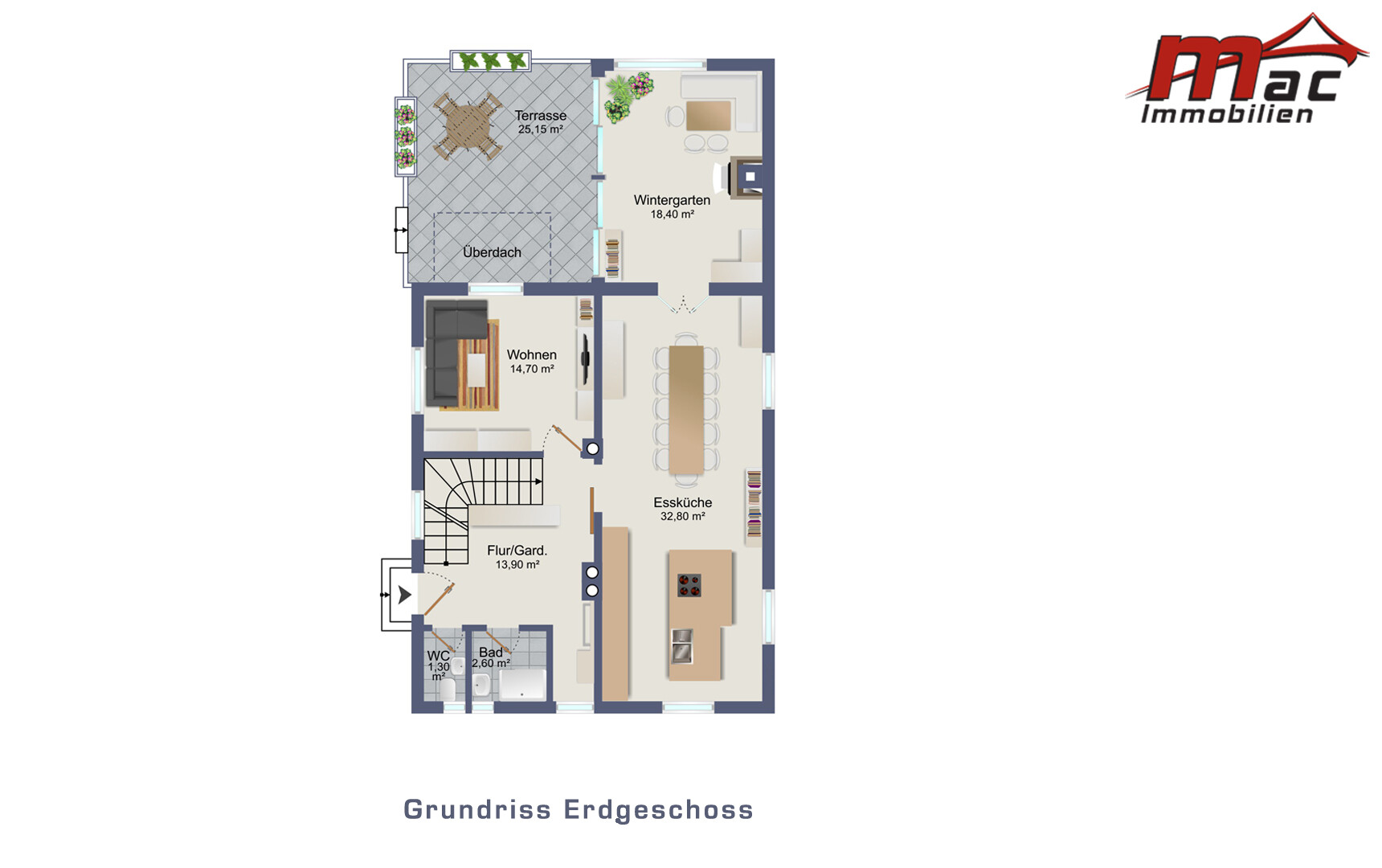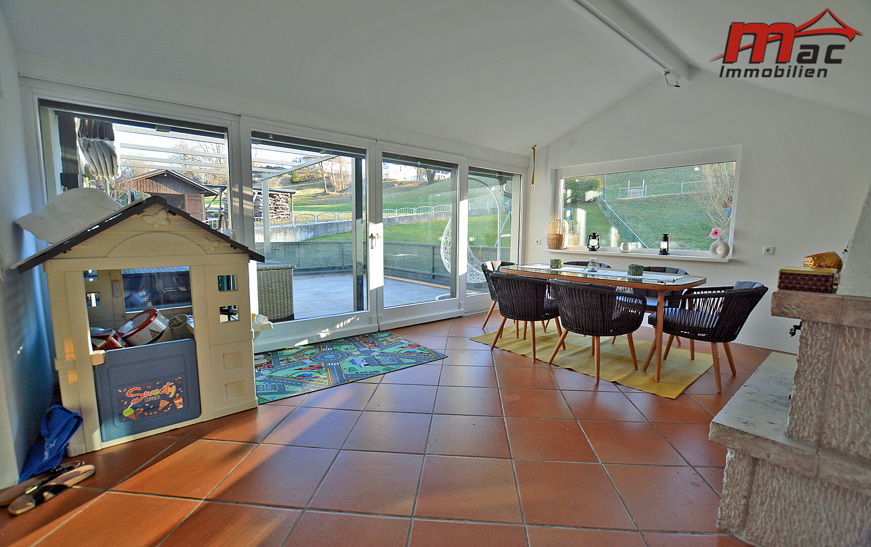 Ein besonderes Highlight ist der 18,40 m² große, südlich ausgerichtete Wintergarten mit offener Feuerstelle, der ganzjährig eine behagliche Atmosphäre schafft.