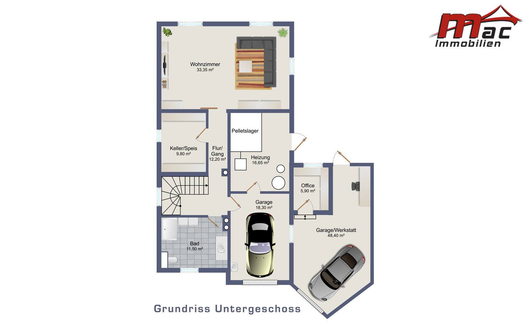 Auch im Bereich Parken und Arbeiten bietet die Liegenschaft außergewöhnlichen Komfort. Eine großzügige Garage mit beheizter Werkstatt mit 48,40 m² und einer Raumhöhe von 3,34 m lässt jedes Schrauberherz höherschlagen.