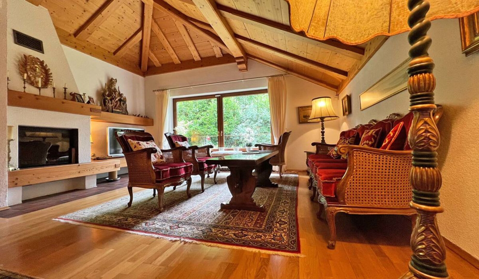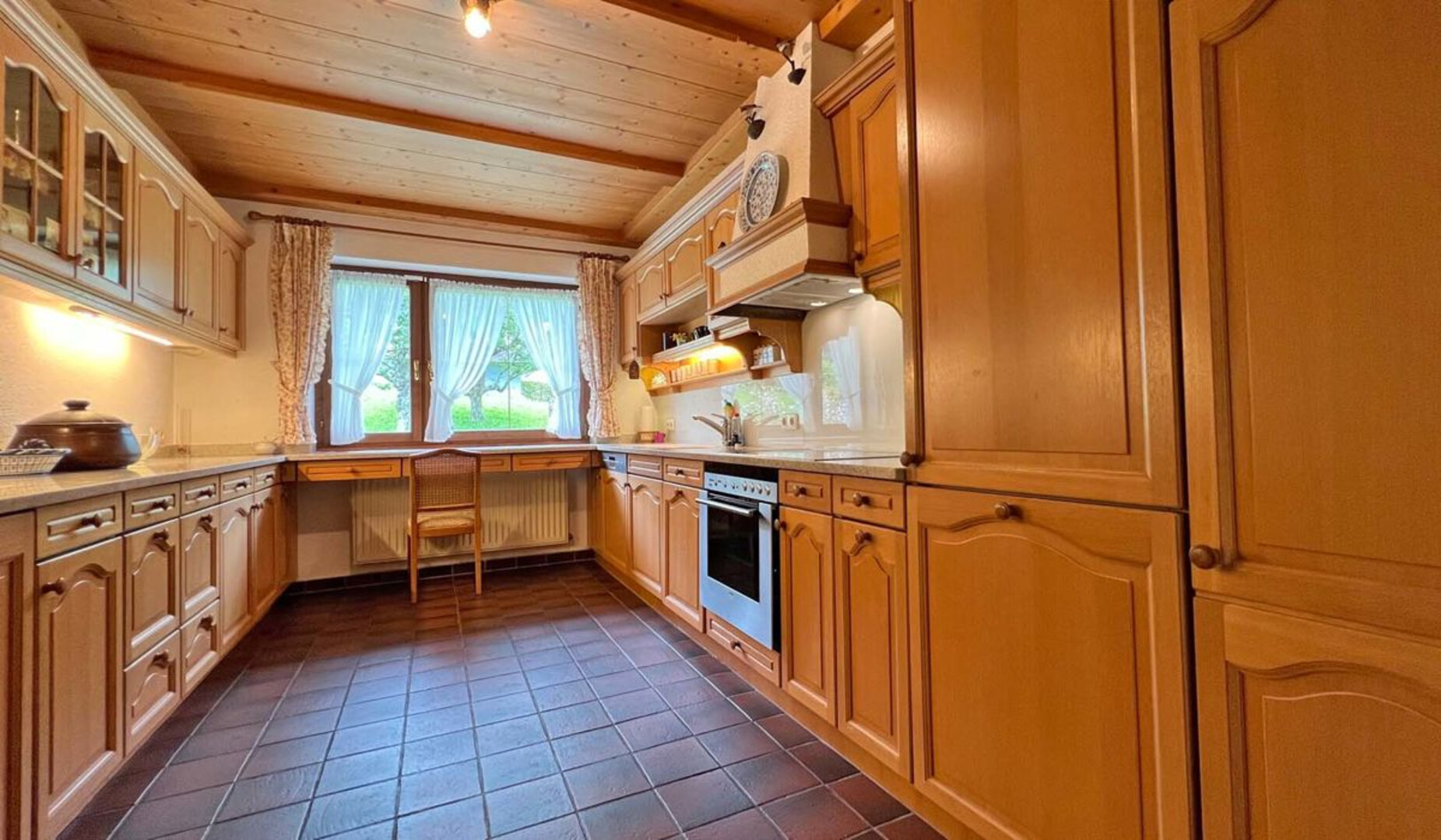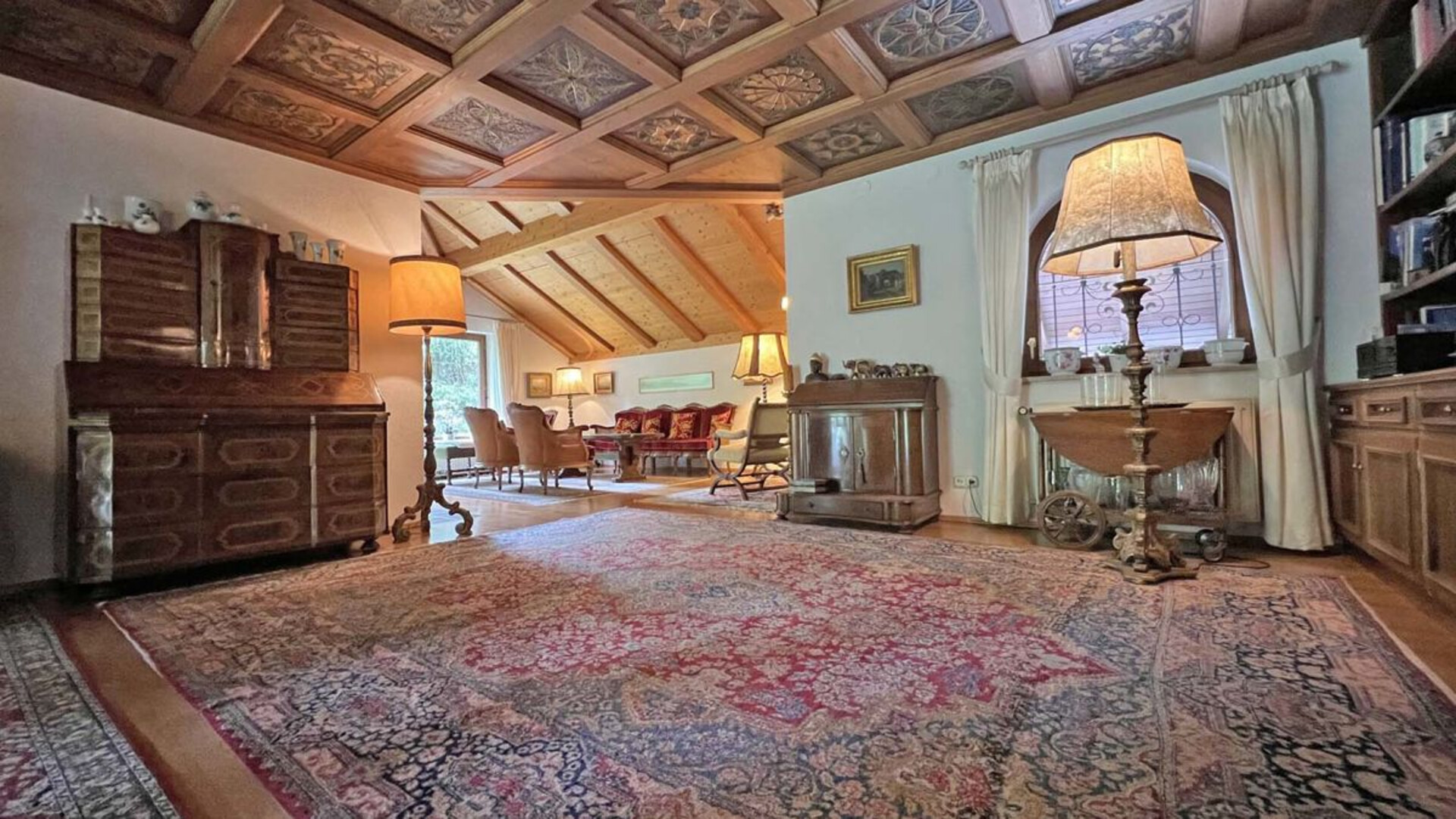Daraus ergeben sich verschiedene Nutzungsmöglichkeiten. Zum einen können Haus und Hallenbad weiter wie bisher als großzügiges Einfamilienanwesen genutzt werden. Das Haus bietet dabei eine großzügige Wohnebene mit Wohnbereich mit Kamin, Stube mit Kachelofen, Küche, Bade- und Elternschlafzimmer sowie repräsentativem Eingangsbereich im Erdgeschoss. Ein besonderes Ausstattungsmerkmal ist die reich geschnitzte Kassettendecke im Wohn- und Eingangsbereich. Im Hanggeschoss sind zwei weitere Schlafzimmer und ein Bad mit Dusche untergebracht. Heizungsraum, zwei Lagerräume und schließlich die Doppelgarage runden dieses Geschoss ab. Das Hallenschwimmbad mit 8 x 3,8 x 1,3 Meter großem Becken verfügt über eine eigene Dusche und WC, ebenso über eine eigene Gastherme.