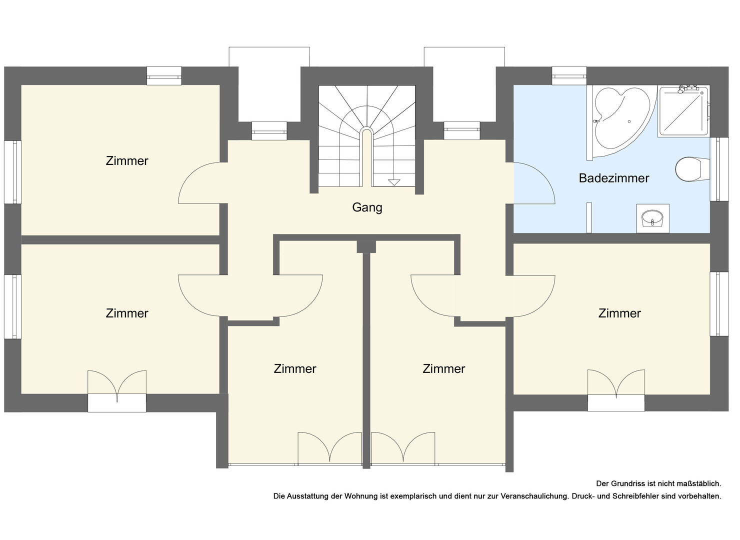 Im Erdgeschoss befinden sich außerdem ein Gäste-WC, ein Abstellraum, sowie der Technikraum. Über die Treppe gelangt man in das Obergeschoss. In diesem Geschoss befinden sich 5 Zimmer, sowie das großzügige und helle Badezimmer, welches mit einer bodenebenen Dusche, und einer Eckbadewanne ausgestattet ist.