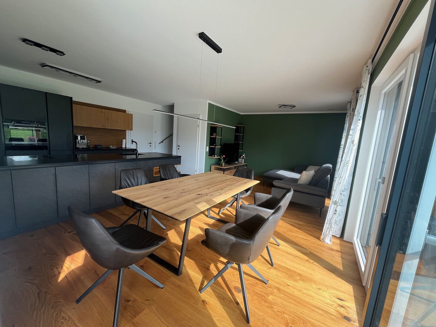Im großzügigen Wohn- und Essbereich mit edlem Parkettboden, hochwertigen Materialien und harmonischen Farben erleben Sie Wohnkomfort auf höchstem Niveau.