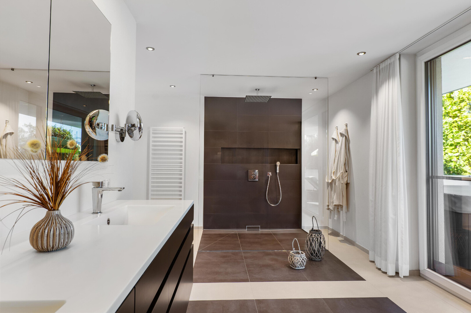 Zu den besonderen Merkmalen gehören ein Kamin für gemütliche Abende, ein Whirlpool auf der Terrasse im Obergeschoss, ein ca. 22 m² großes Badezimmer mit einer finnischen Sauna mit Infrarot für entspannende Wellness-Momente und eine barrierefreie Ausstattung. Auf dem Dach sind eine erst 2022 errichtete Photovoltaik- und Solaranlage vorhanden, daher können die Betriebskosten des Hauses sehr gering gehalten werden. Mit zwei Garagenplätzen, separatem Badezimmer im Erdgeschoss und 3 Schlafzimmern bietet dieses Haus höchsten Komfort. Angrenzend zur Küche befindet sich eine knapp 3 m² große Speisekammer. Das Arbeitszimmer im Obergeschoss wird derzeit als Fitnessraum genutzt.