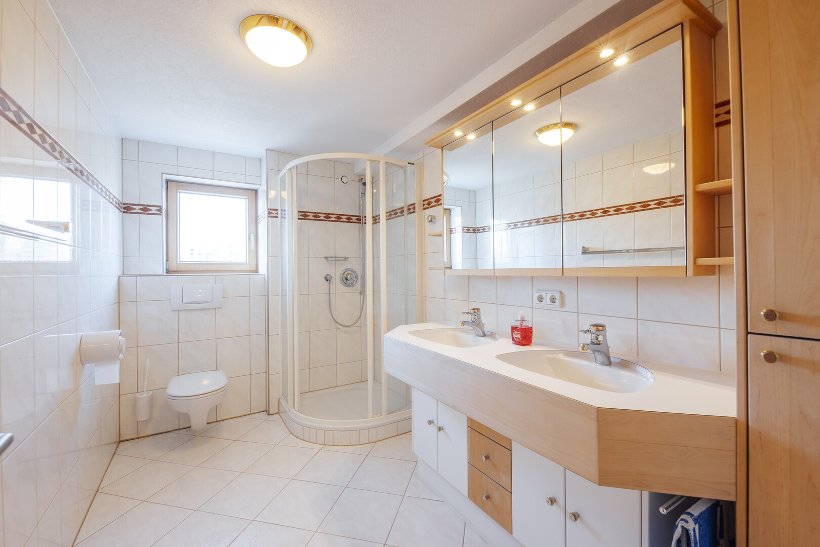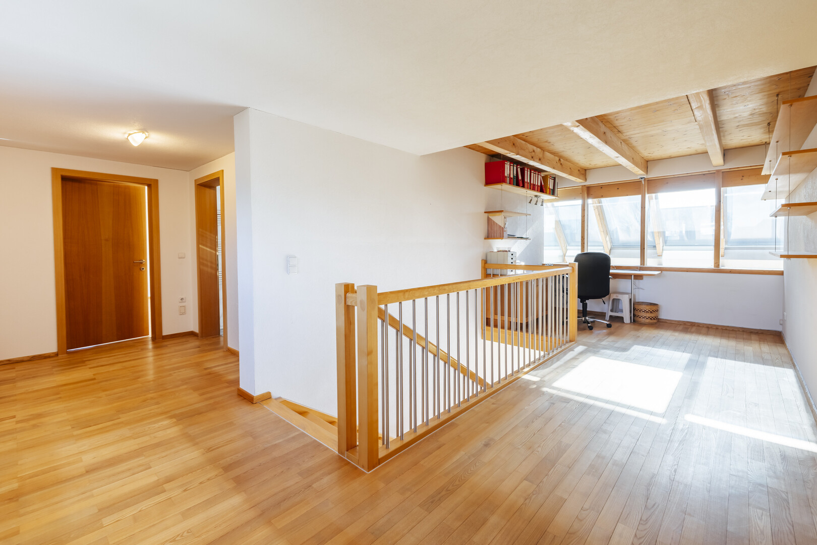 Im Obergeschoss befinden sich zwei großzügige Schlafzimmer mit Galerieblick in den Wintergarten und den Wellnessbereich. Zusätzlich stehen ein offener Bürobereich sowie zwei helle Badezimmer mit Doppelwaschbecken, Dusche und Toilette zur Verfügung. Eines der Bäder ist zusätzlich mit einer Eckbadewanne ausgestattet. Das Hauptschlafzimmer bietet Zugang zu einer weiteren, nach Osten ausgerichteten, überdachten Terrasse.