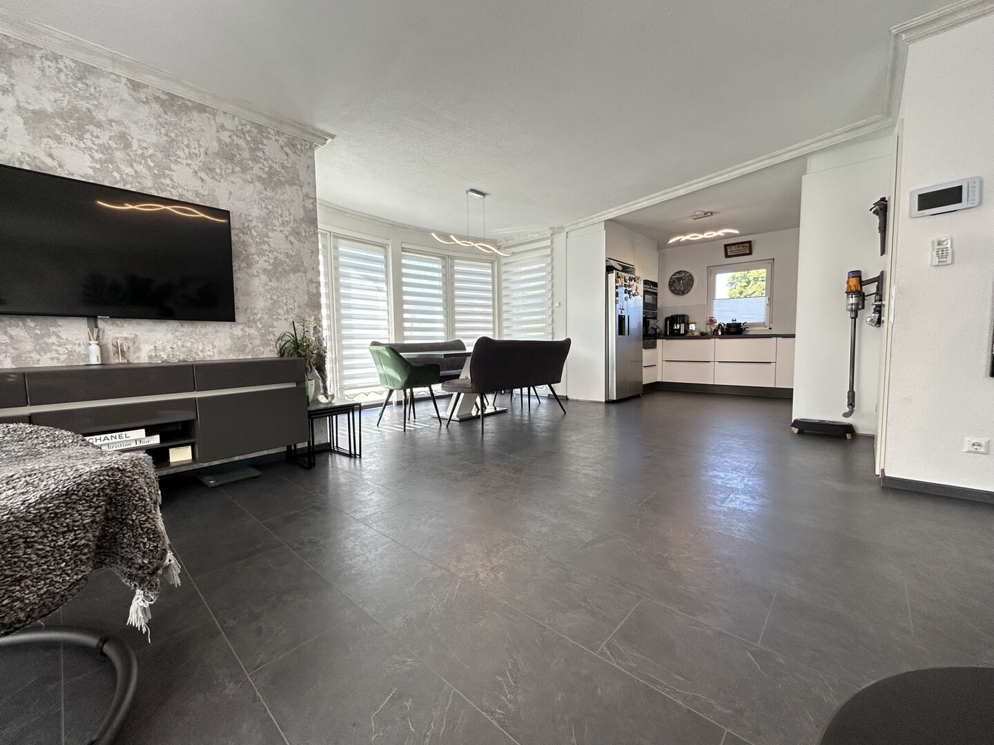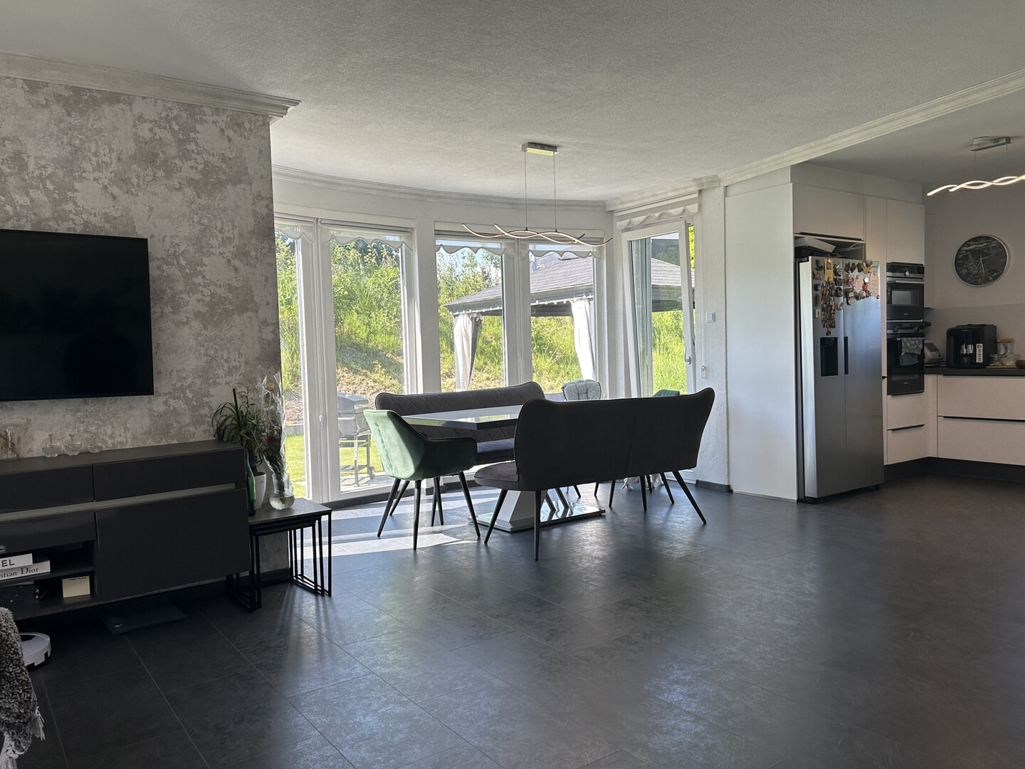 Herzstück des Hauses ist das großzügige Wohn- und Esszimmer, das nahtlos in die moderne Küche übergeht. Große Fensterflächen schaffen einen direkten Bezug zum Garten und lassen viel Tageslicht in die Räume.