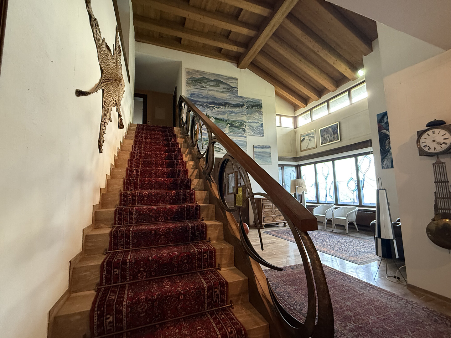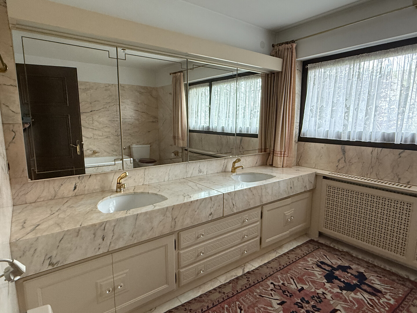 Das elterliche private Bad wurde mit Marmor ausgestattet, die Steinböden im Haus sind ausgesprochen hochwertig. Was natürlich nicht fehlen darf ist der Wäscheschacht. Der Garten ist über die Jahre zu einem kleinen Park geworden.