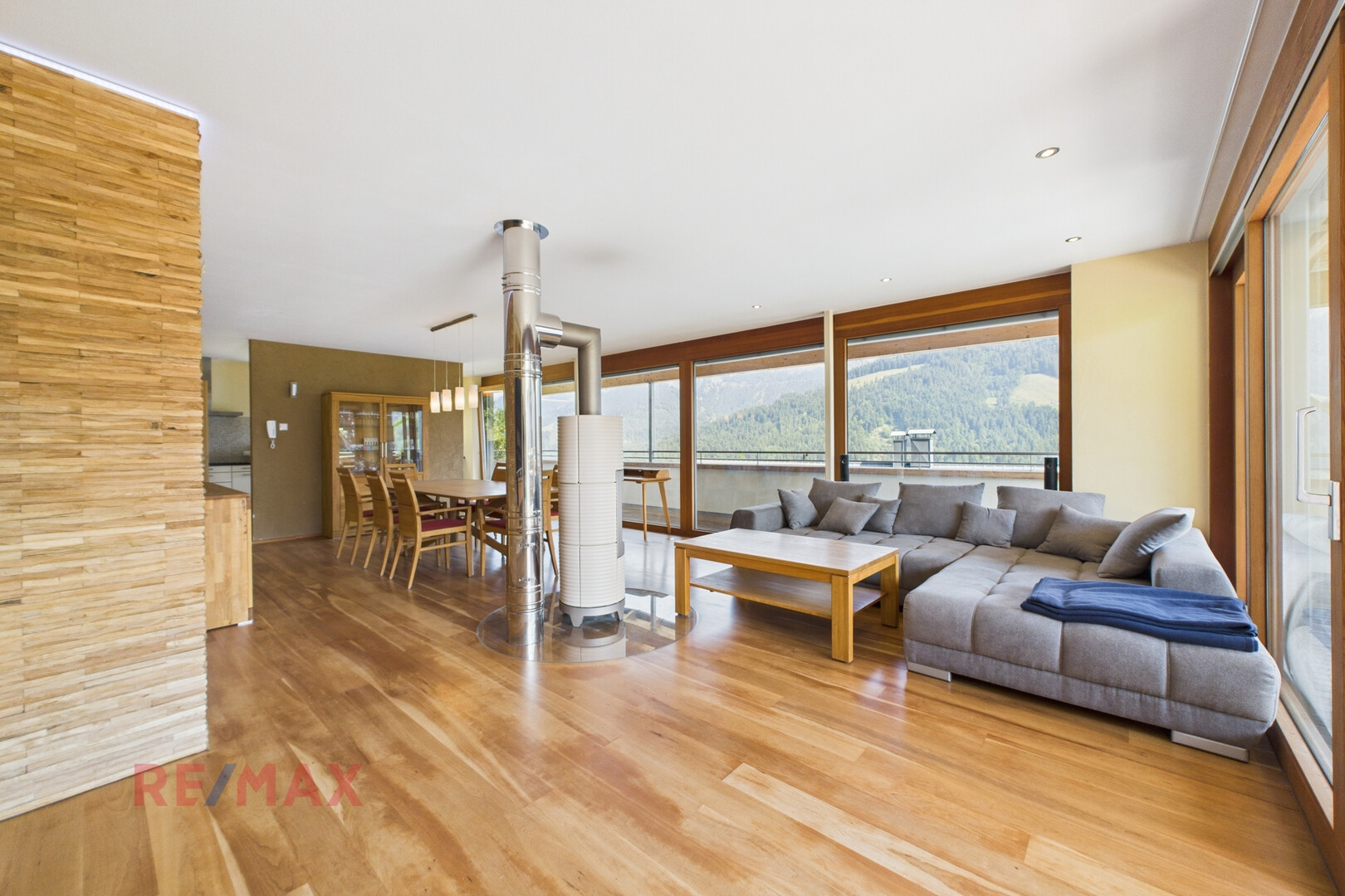 Im zweiten Obergeschoss öffnet sich ein großzügiger Wohn- und Essbereich mit moderner Küche. Der behagliche Schwedenofen im Wohnzimmer sorgt für eine gemütliche Atmosphäre, während die Terrasse mit ihrem weiten Blick in die Natur zu entspannten Stunden einlädt.