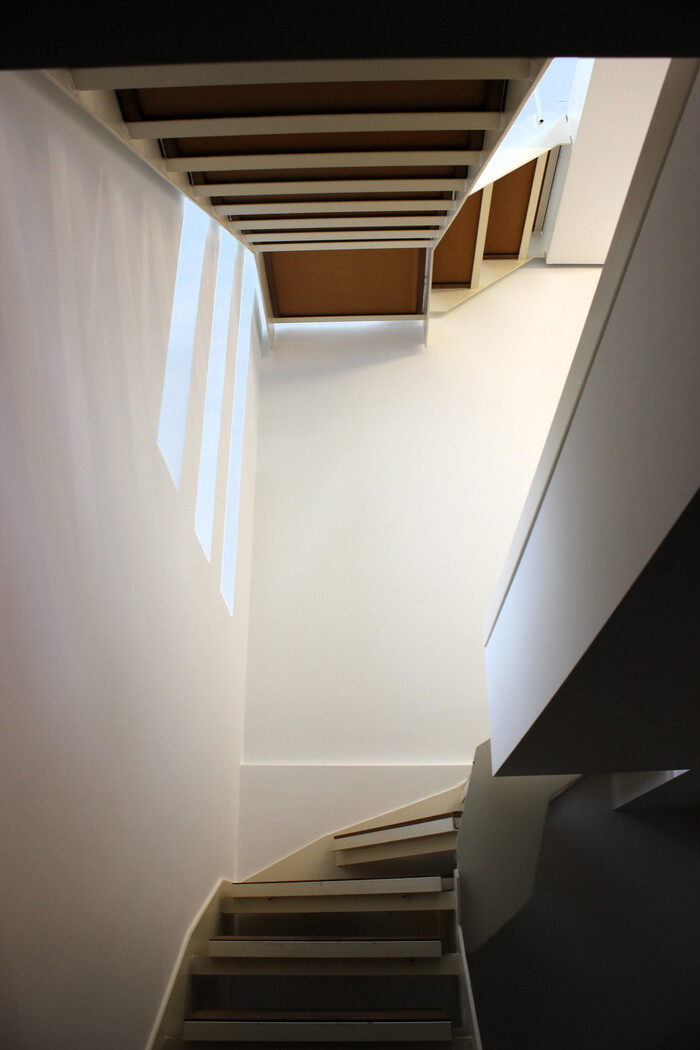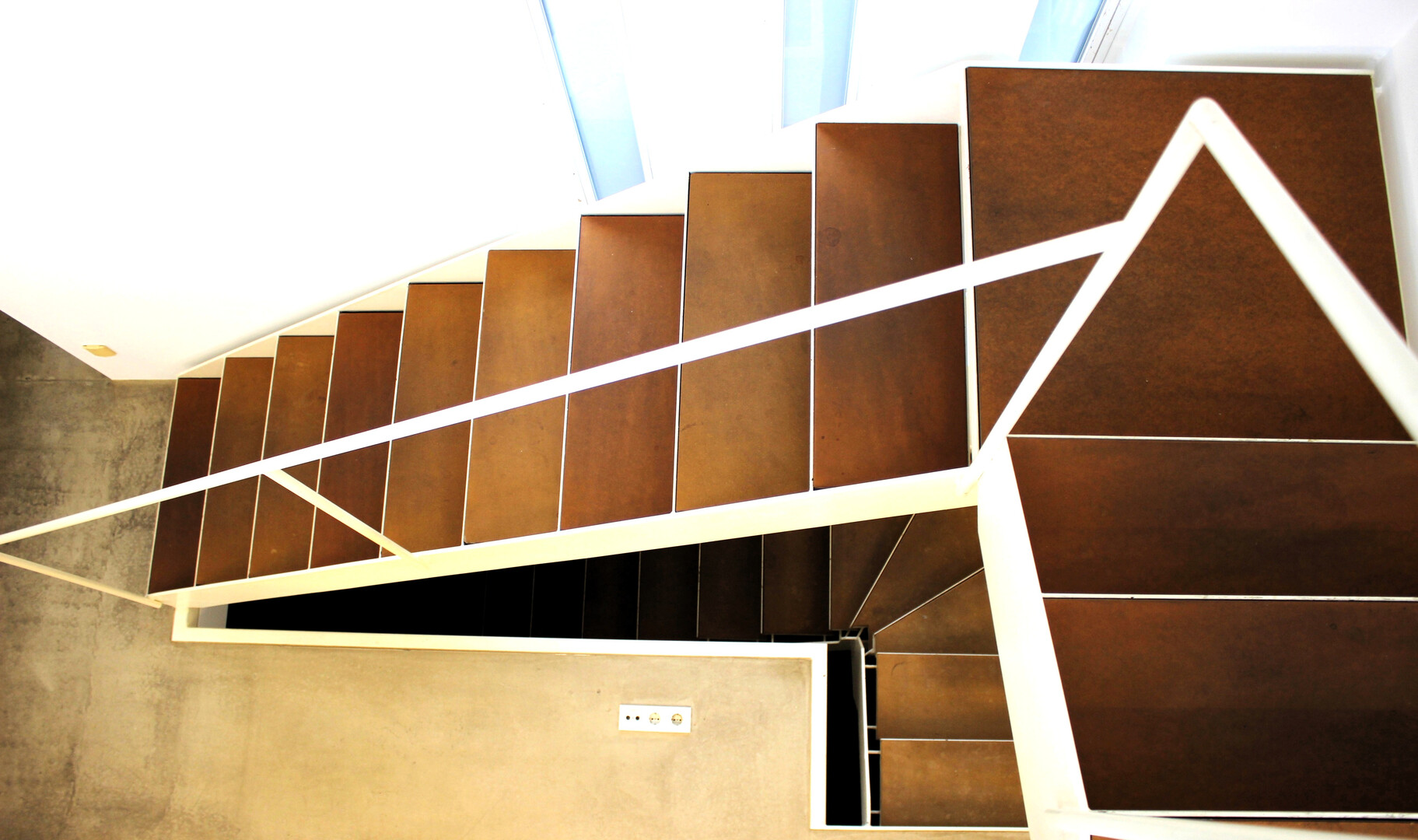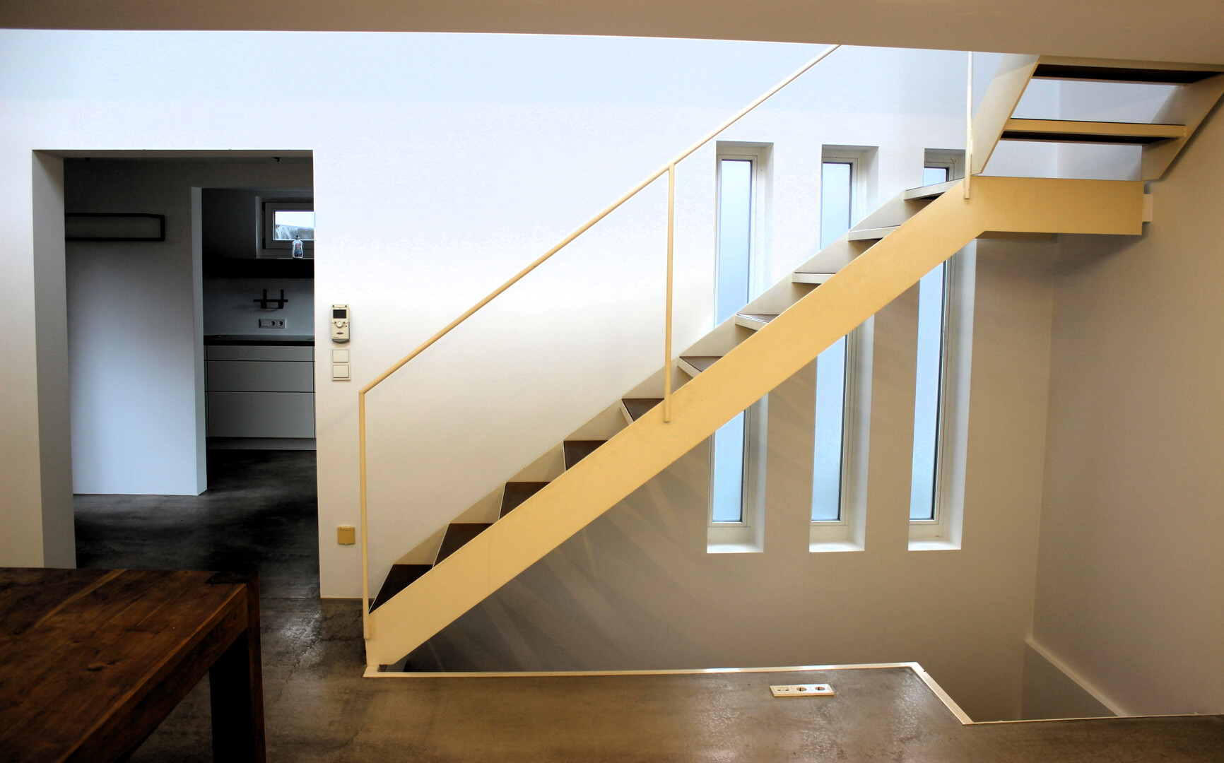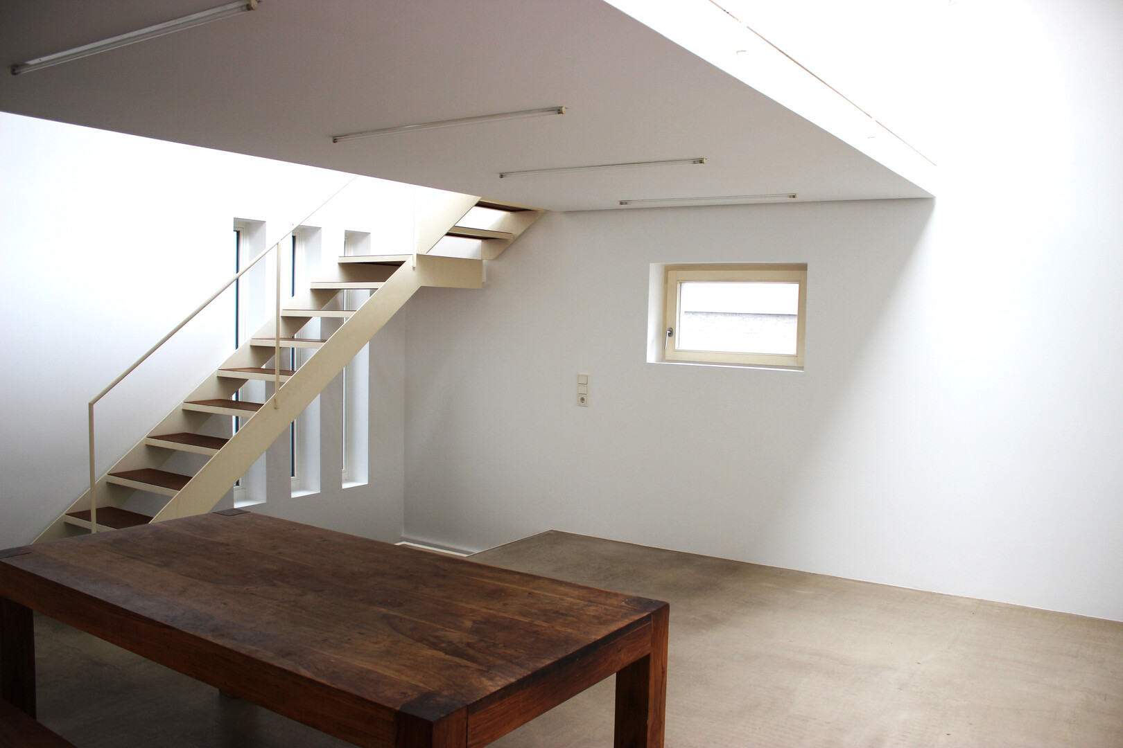 Im Erdgeschoss befindet sich ein offener Wohn- und Essbereich mit minimalistischer Gestaltung. Elemente wie eine filigrane Stahltreppe und glatte, fugenlose Böden verleihen dem Raum eine besondere architektonische Leichtigkeit.