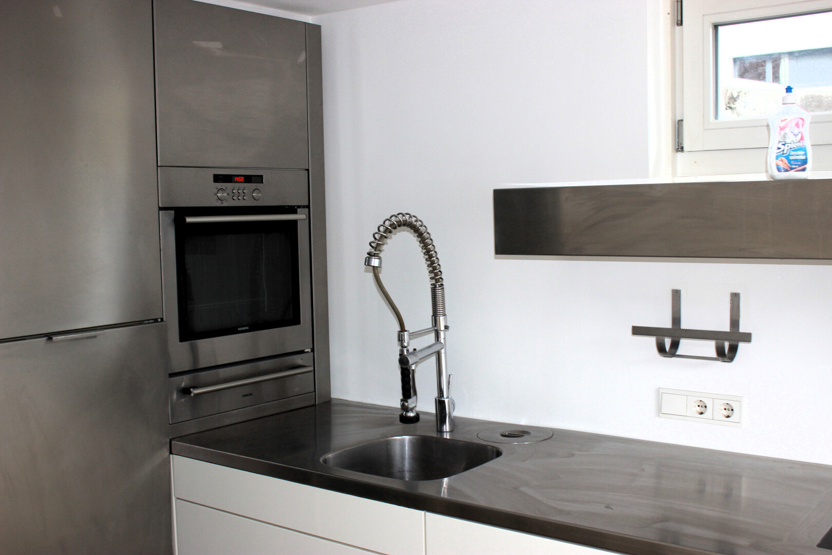 Die angrenzende Küche ist in elegantem Edelstahl gehalten und vollständig ausgestattet. Das robuste Material unterstreicht den modernen Charakter und macht die Küche besonders pflegeleicht und langlebig.