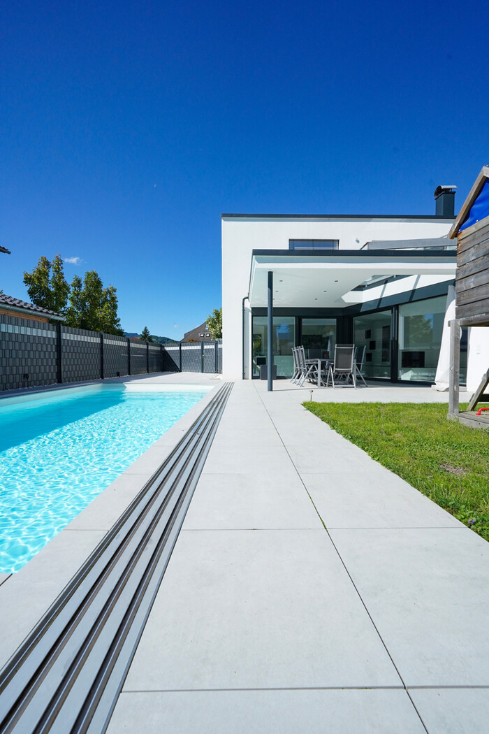 beheizter Swimmingpool 9 x 4 Meter mit Gegenstromanlage und Domabdeckung