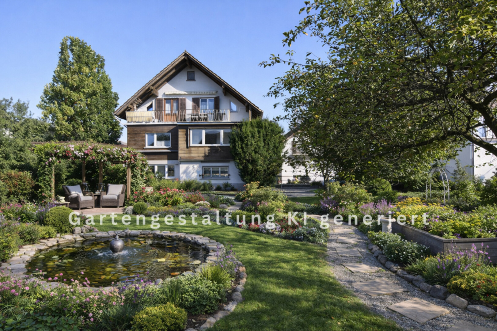 Des Weiteren weisen wir darauf hin, dass es sich bei der Gartengestaltung im zweiten Bild lediglich um eine Visualisierung (KI generiert) handelt.
