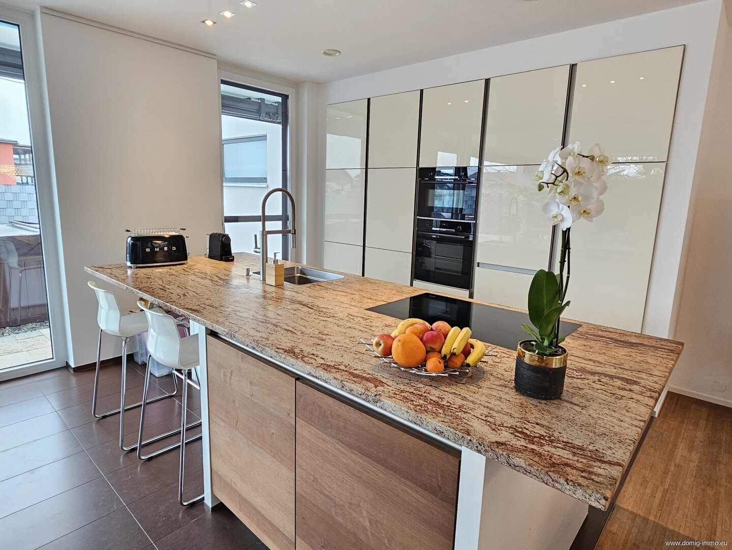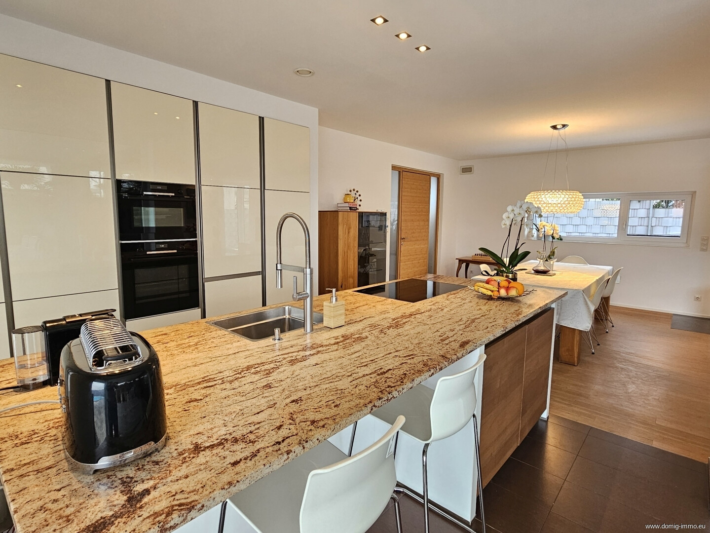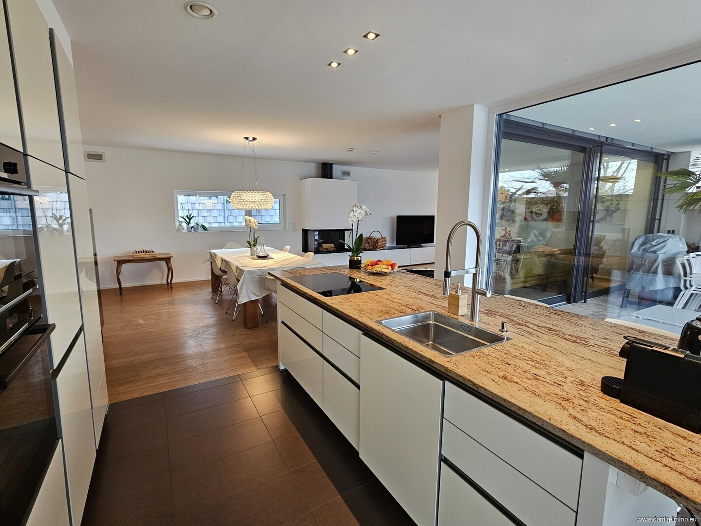 Herzstück des Hauses ist der großzügige Kochen-Essen-Wohnen-Bereich, der Offenheit und Eleganz miteinander verbindet und ideale Voraussetzungen für geselliges Beisammensein sowie entspannte Familienabende bietet. Große Fensterflächen sorgen für viel Tageslicht und schaffen fließende Übergänge zwischen Innen- und Außenbereich. Die hochwertige Ausstattung unterstreicht den modernen Charakter des Hauses und verleiht jedem Raum eine exklusive Note.