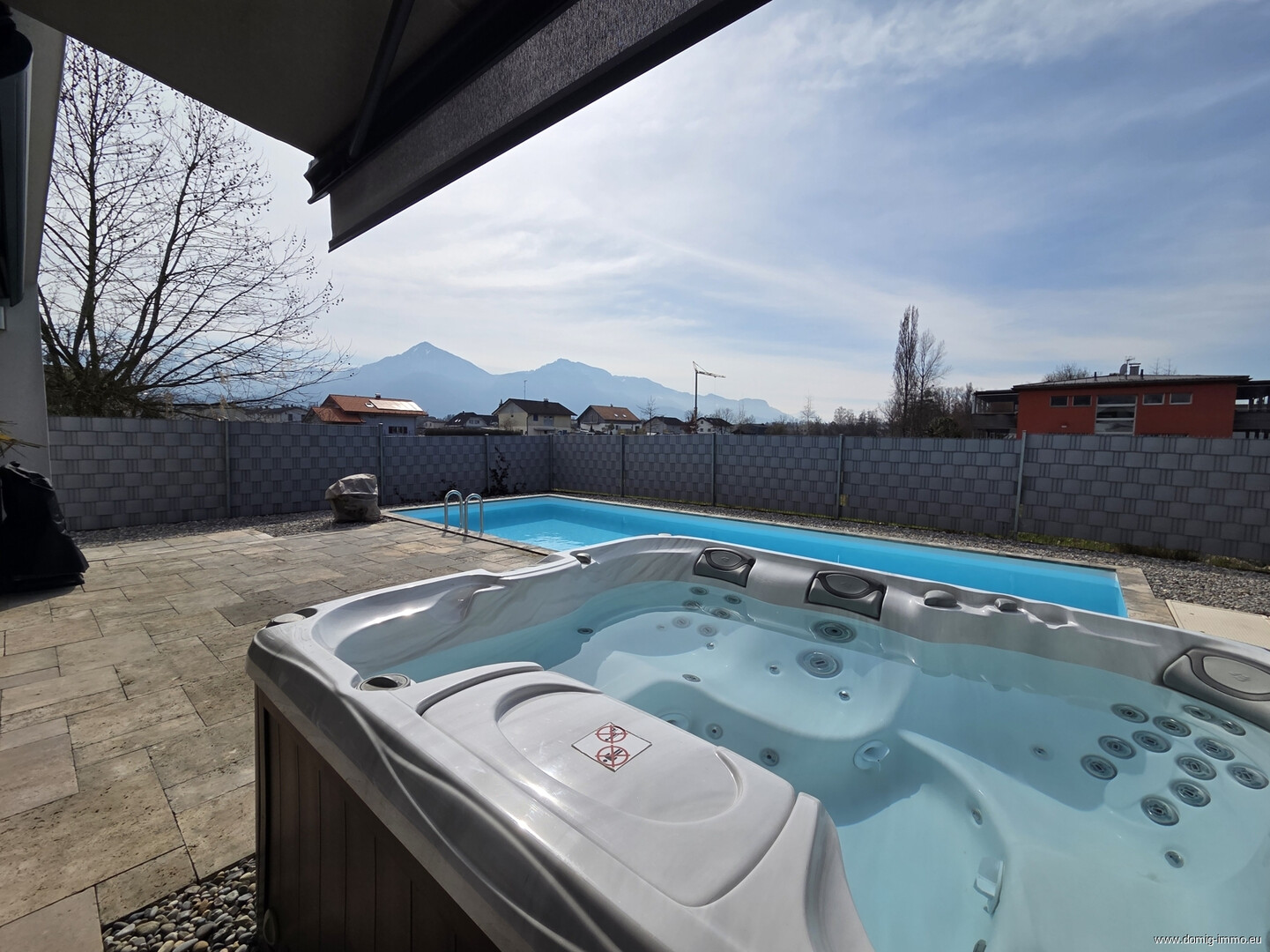 Für ein angenehmes Raumklima sorgen eine effiziente Gasheizung, eine kontrollierte Be- und Entlüftung, die ganzjährig für frische Luft und hohen Wohnkomfort sorgt, sowie eine moderne Solaranlage zur nachhaltigen Energiegewinnung. Ein moderner Schwedenofen schafft zusätzlich eine behagliche Wohnatmosphäre und wohlige Wärme an kühleren Tagen. Wellnessliebhaber kommen im eigenen Jacuzzi voll auf ihre Kosten, während die großzügige Terrasse mit Swimmingpool zu erholsamen Stunden im Freien einlädt. Eine weitere Terrasse im Obergeschoss bietet zusätzlichen Platz für Rückzug und Entspannung mit schönem Ausblick.