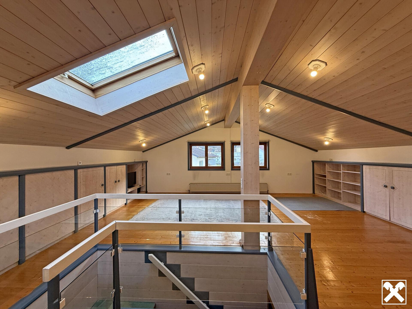 Nutzfläche von rund 217 m² verteilt sich großzügig auf zwei Ebenen. Über das Stiegenhaus gelangt man vom Eingangsbereich in das großzügige Obergeschoss.