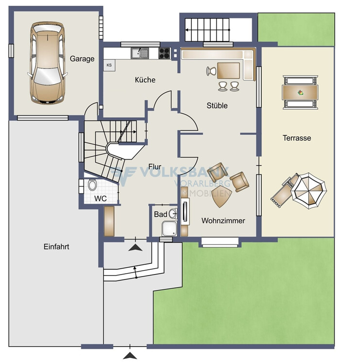 Im Erdgeschoss befinden sich der Windfang im Eingangsbereich, Bad mit Dusche, Küche, Ess- und Wohnzimmer sowie ein separates WC.