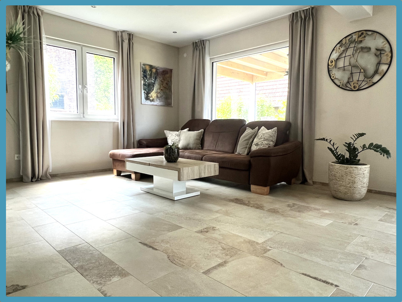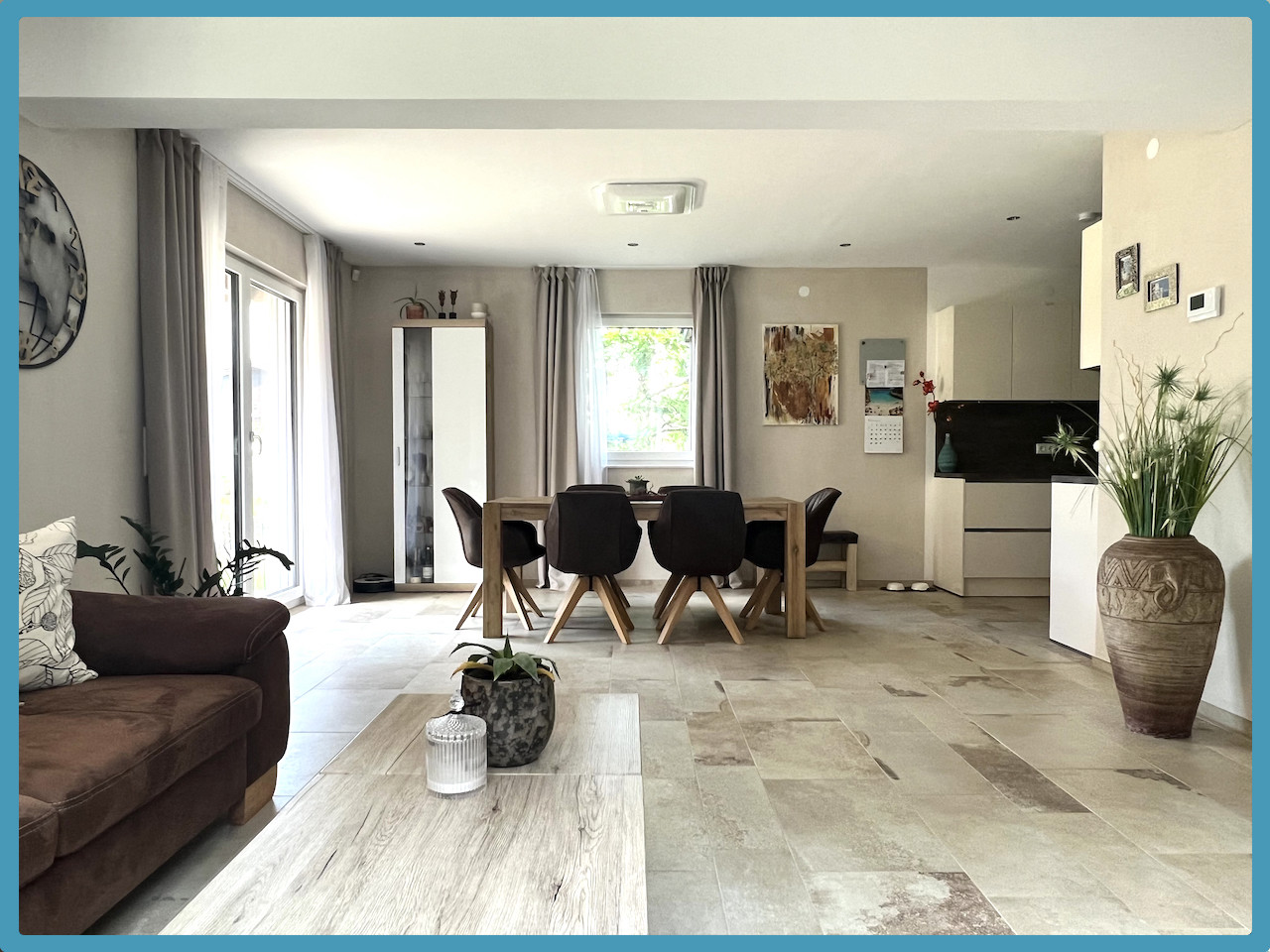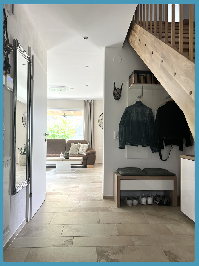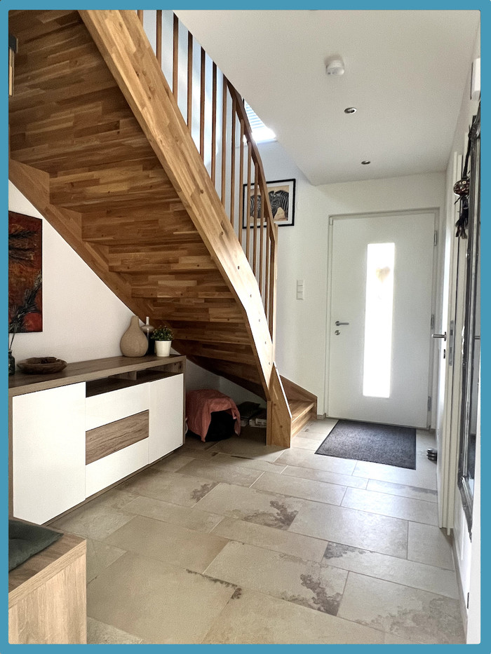 Im Erdgeschoss befinden sich ein großes Wohnzimmer/Esszimmer (hochwertiger Fliesenboden) und Zugang auf die große überdachte Terrasse (ca. 24,00 m²) sowie den gepfelgten Garten, Küche mit gut ausgestatteter und hochwertiger Einbauküche, Gang, WC, Abstellraum/Technikraum.