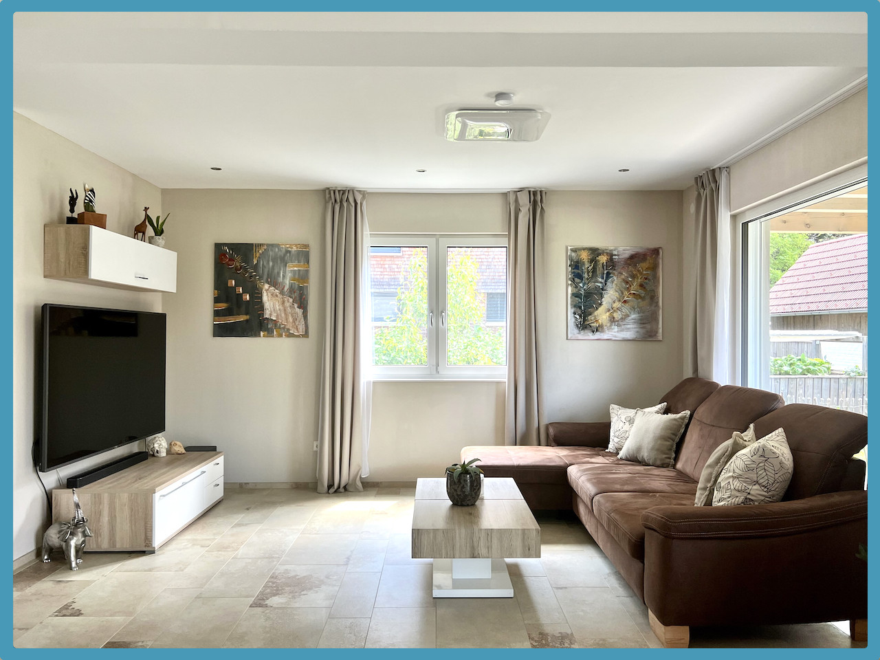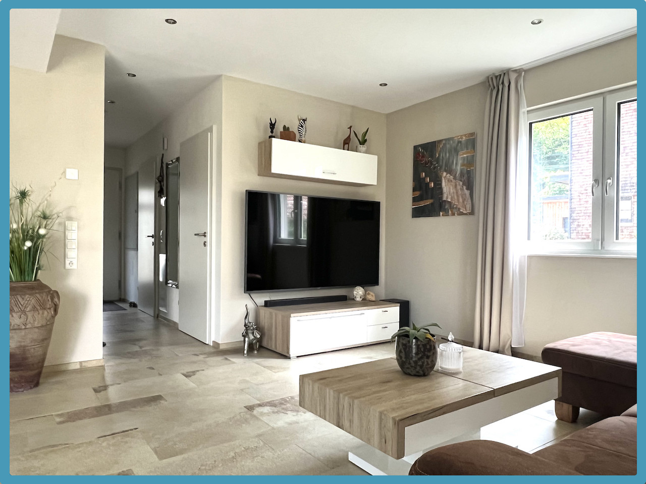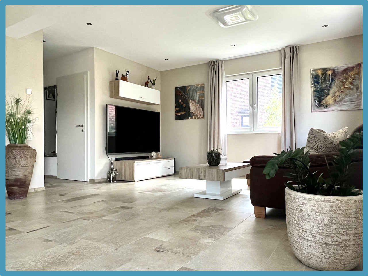 Im Erdgeschoss befinden sich ein großes Wohnzimmer/Esszimmer (hochwertiger Fliesenboden) und Zugang auf die große überdachte Terrasse (ca. 24,00 m²) sowie den gepfelgten Garten, Küche mit gut ausgestatteter und hochwertiger Einbauküche, Gang, WC, Abstellraum/Technikraum.