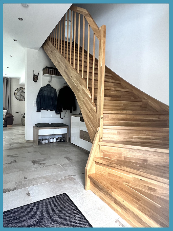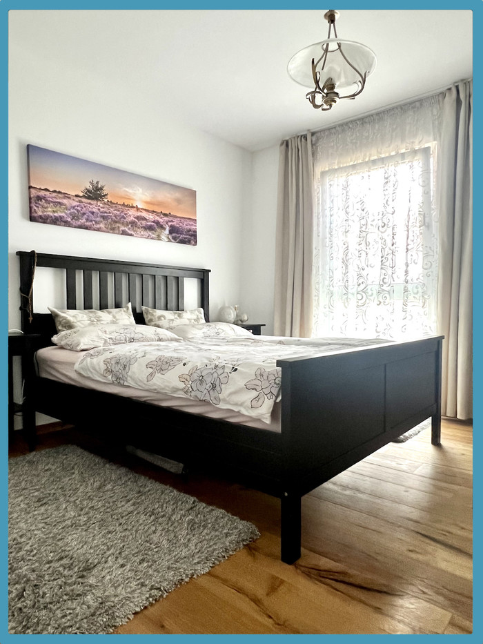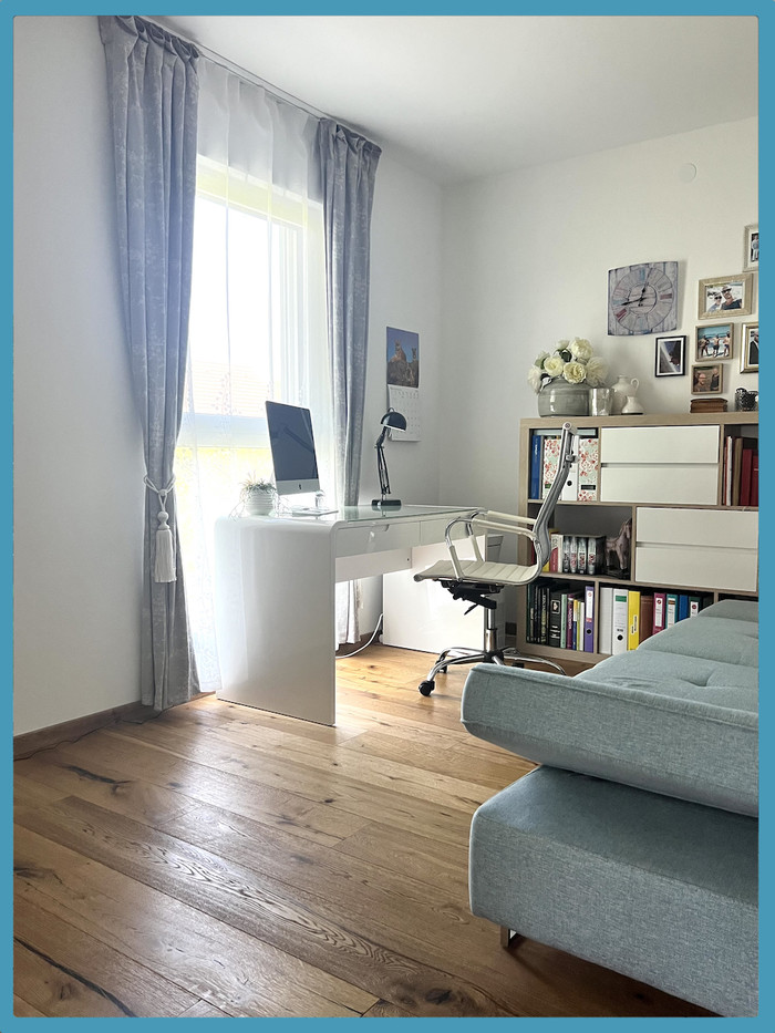 Über das Stiegenhaus mit schöner Vollholztreppe gelangen Sie in das Obergeschoss mit 3 großen Schlafzimmern - klimatisiertes Elternschlafzimmer mit begehbarem Schrankraum sowie 2 großzügige Kinderzimmer (alle Zimmer sowie der Gang sind mit Eichenparkett ausgestattet) edles und sehr hochwertig ausgestattetes Badezimmer mit Badewanne, Dusche, WC und Fesnter.