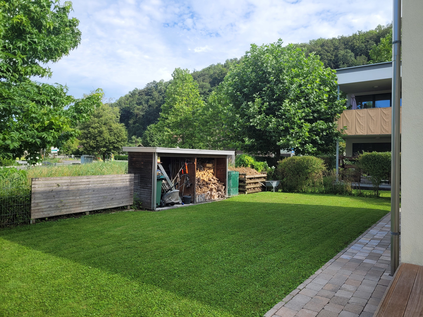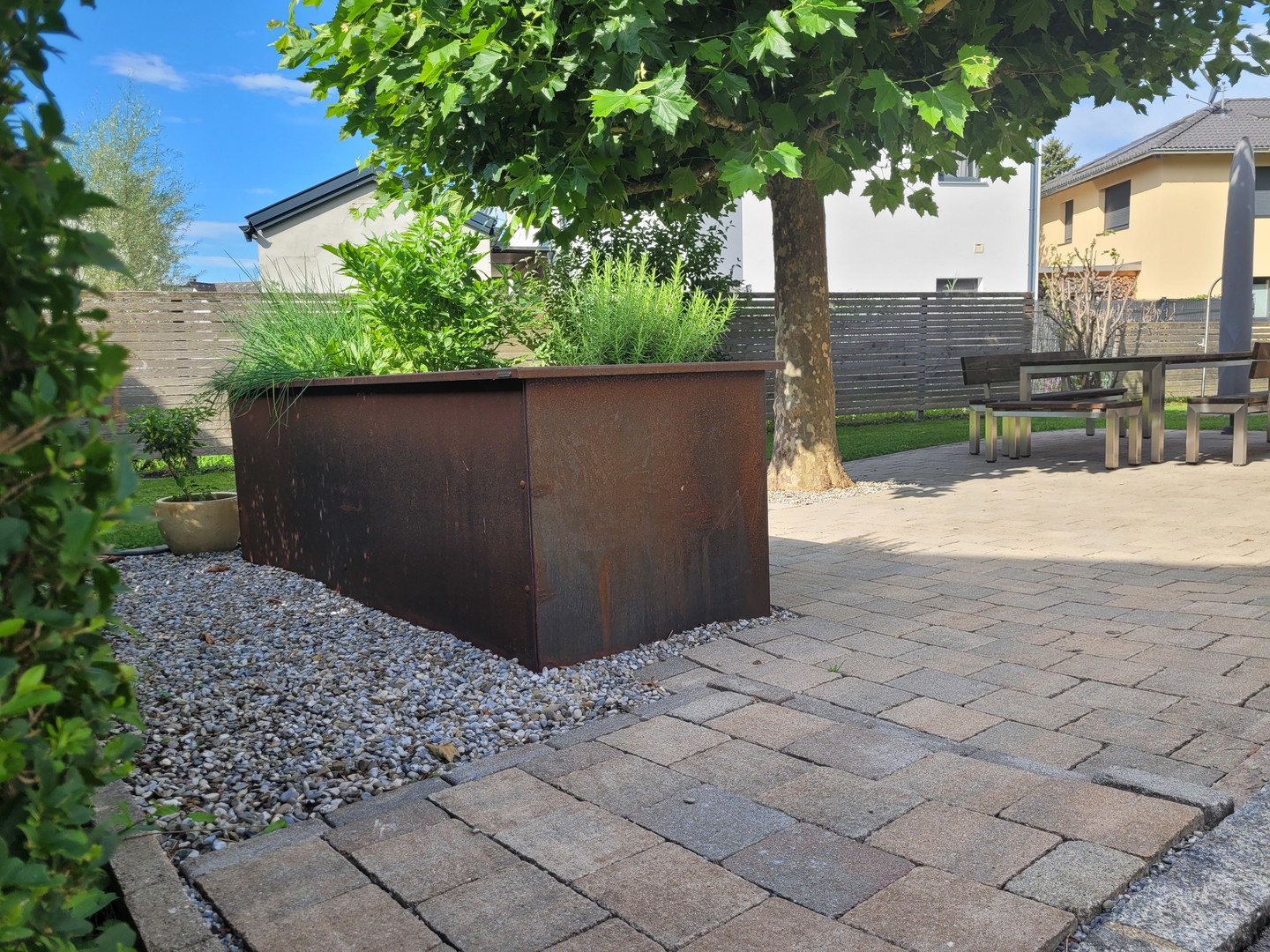 Gartenanlage, Grill, Hochbeet, Einfriedung, Geräte/Holz-Lagerstelle