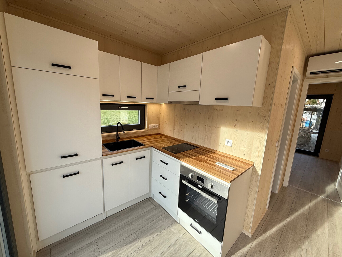 Küche: Einbauküche mit Kühlschrank, Induktionsplatte 2 Kochfelder, Dunstabzugshaube, Spüle, Backofen & Geschirrspüler