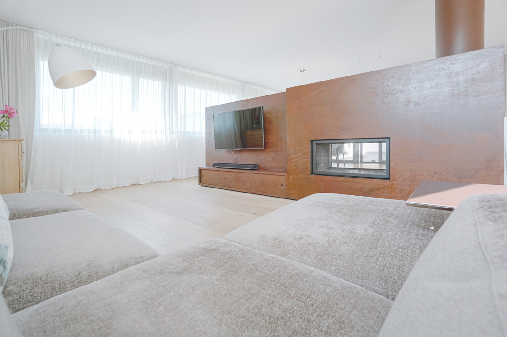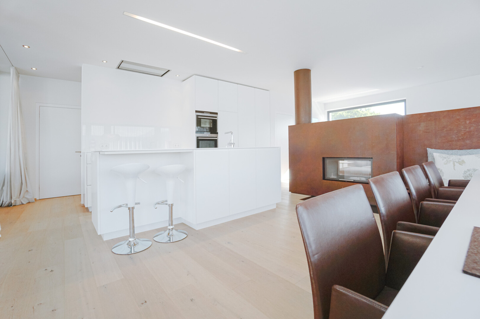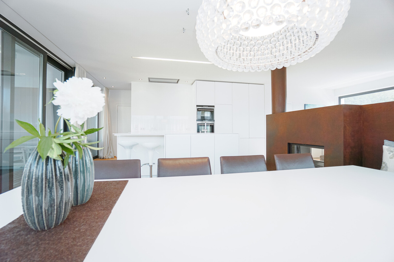 Ein besonderes Highlight des Hauses ist die exklusive Tischlerküche, ausgestattet mit hochwertigen Siemens-Geräten. Dazu zählen ein Backofen, ein Dampfgarer, eine große Induktionskochplatte sowie ein eleganter Falmec-Deckendunstabzug. Der offene Wohn- und Essbereich wird durch teilweise integrierte LED-Lichtprofile stilvoll in Szene gesetzt und bildet das Herzstück des Hauses. Ein absolutes Highlight hier ist der exklusive Ofen, der als Blickfang und Raumtrenner dient. Die große Glasfronten erlauben einen (fast) unverstellten Blick auf die umliegenden Berge.