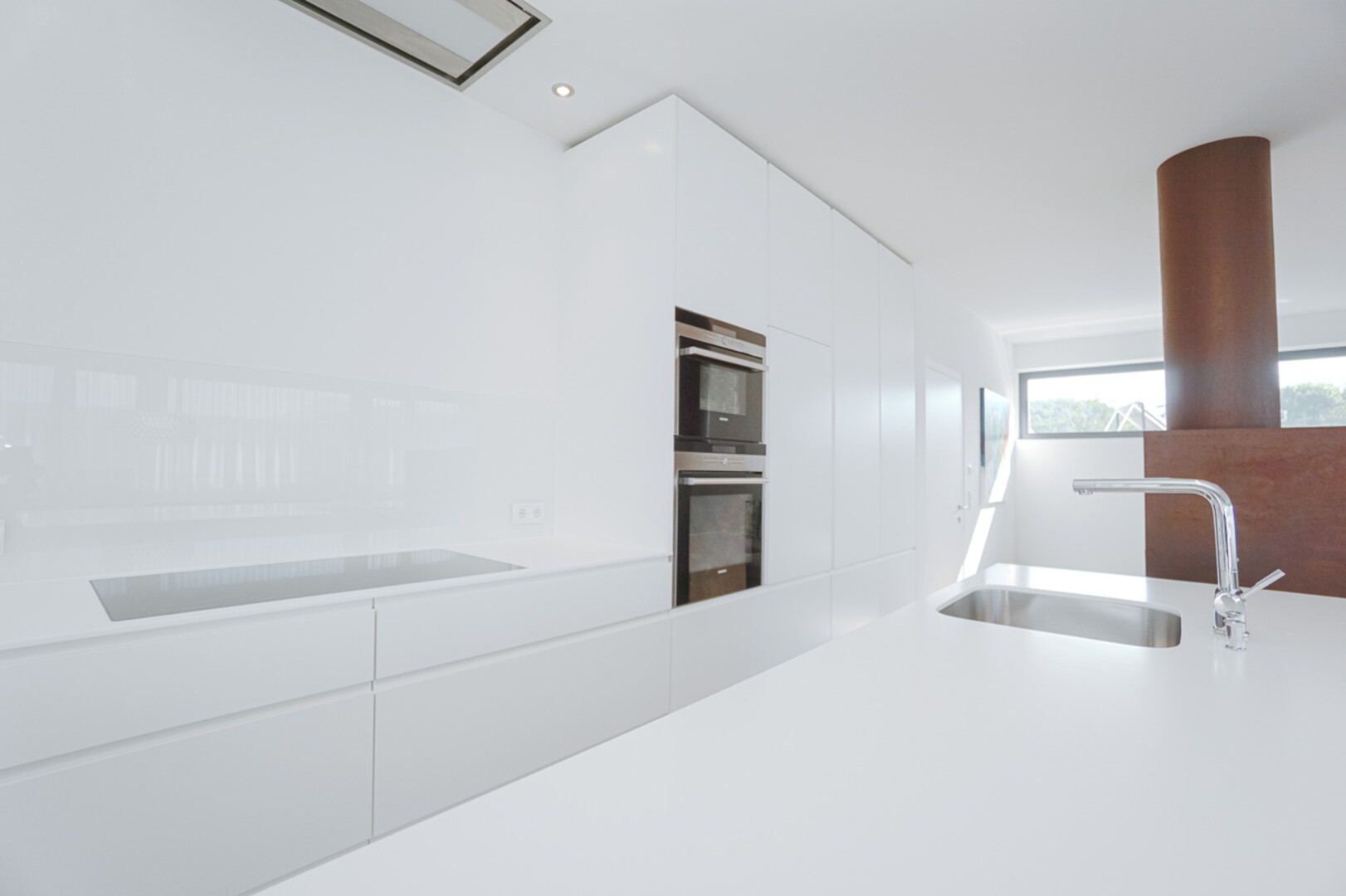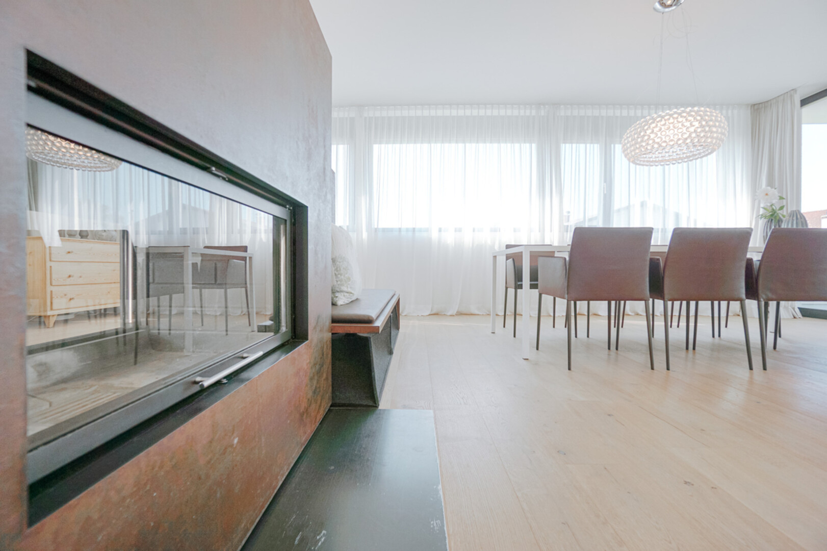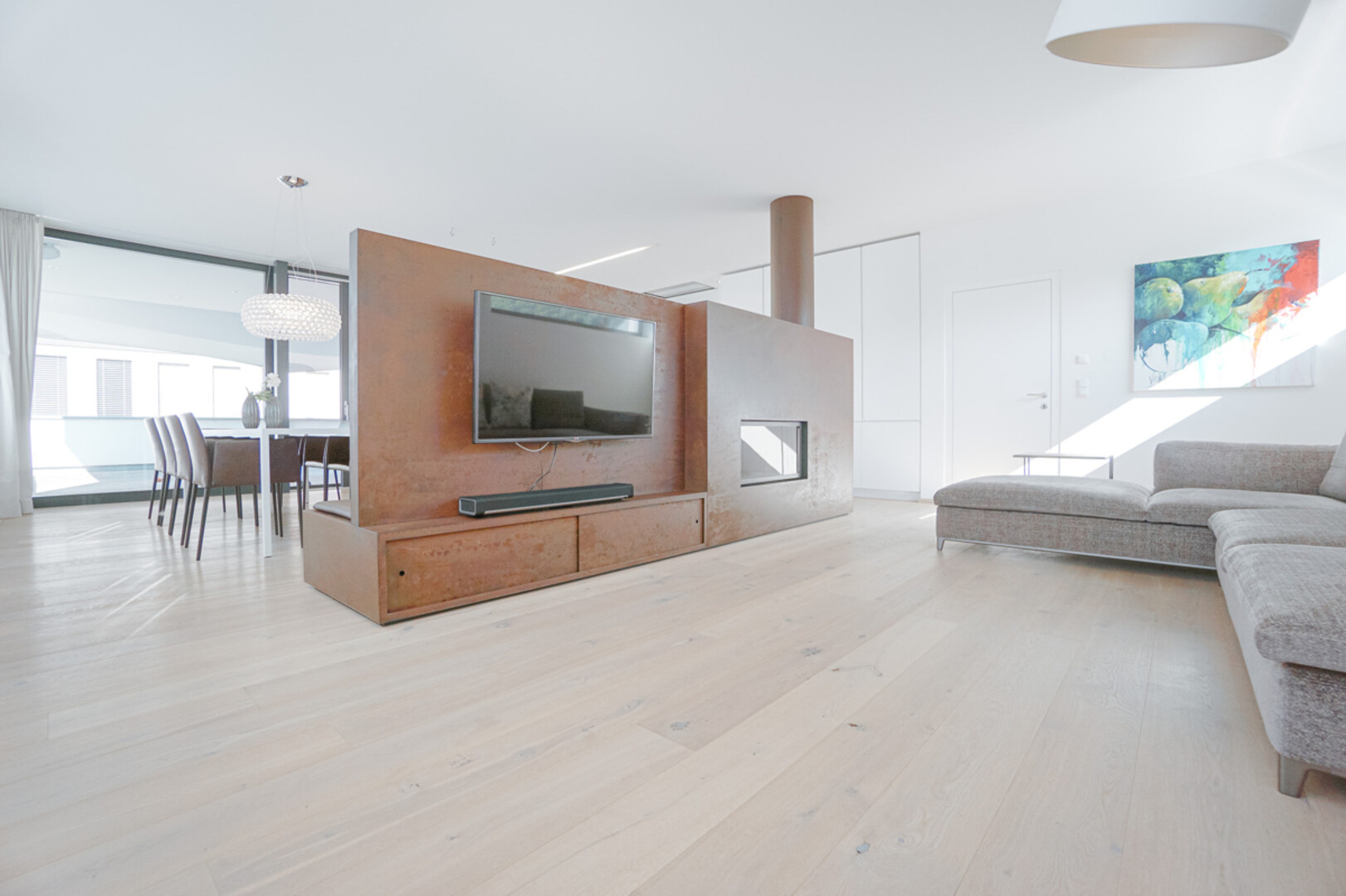 Ein besonderes Highlight des Hauses ist die exklusive Tischlerküche, ausgestattet mit hochwertigen Siemens-Geräten. Dazu zählen ein Backofen, ein Dampfgarer, eine große Induktionskochplatte sowie ein eleganter Falmec-Deckendunstabzug. Der offene Wohn- und Essbereich wird durch teilweise integrierte LED-Lichtprofile stilvoll in Szene gesetzt und bildet das Herzstück des Hauses. Ein absolutes Highlight hier ist der exklusive Ofen, der als Blickfang und Raumtrenner dient. Die große Glasfronten erlauben einen (fast) unverstellten Blick auf die umliegenden Berge.