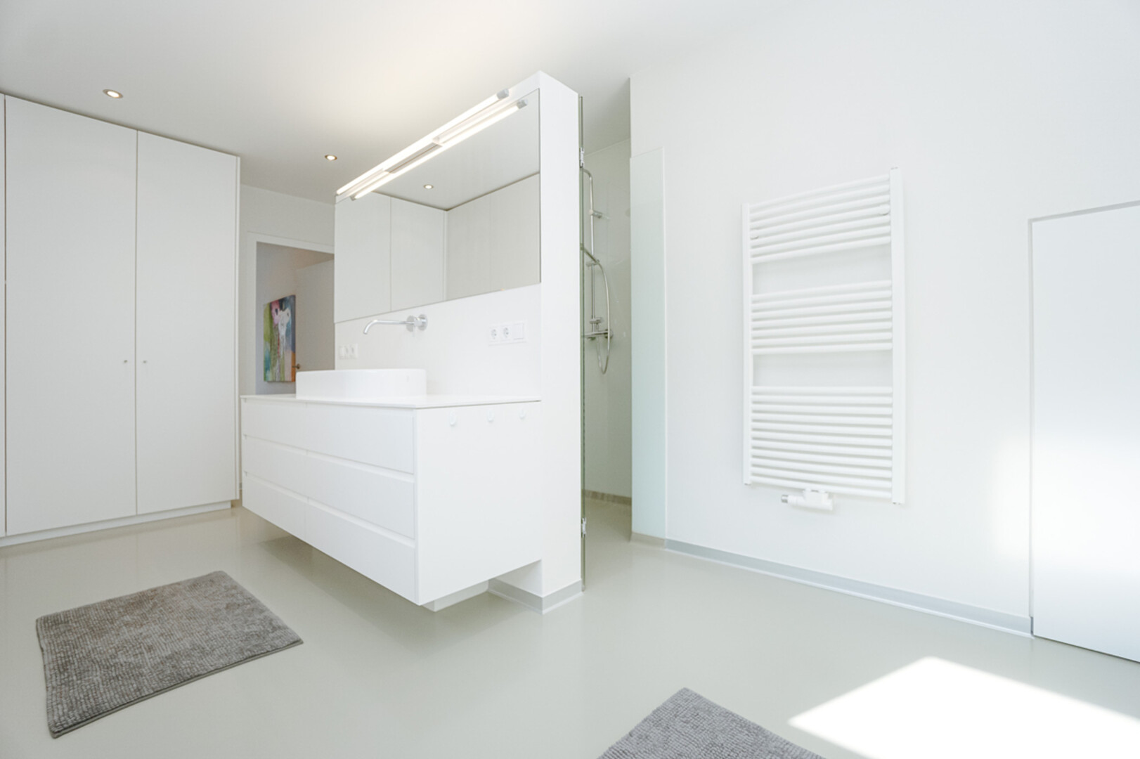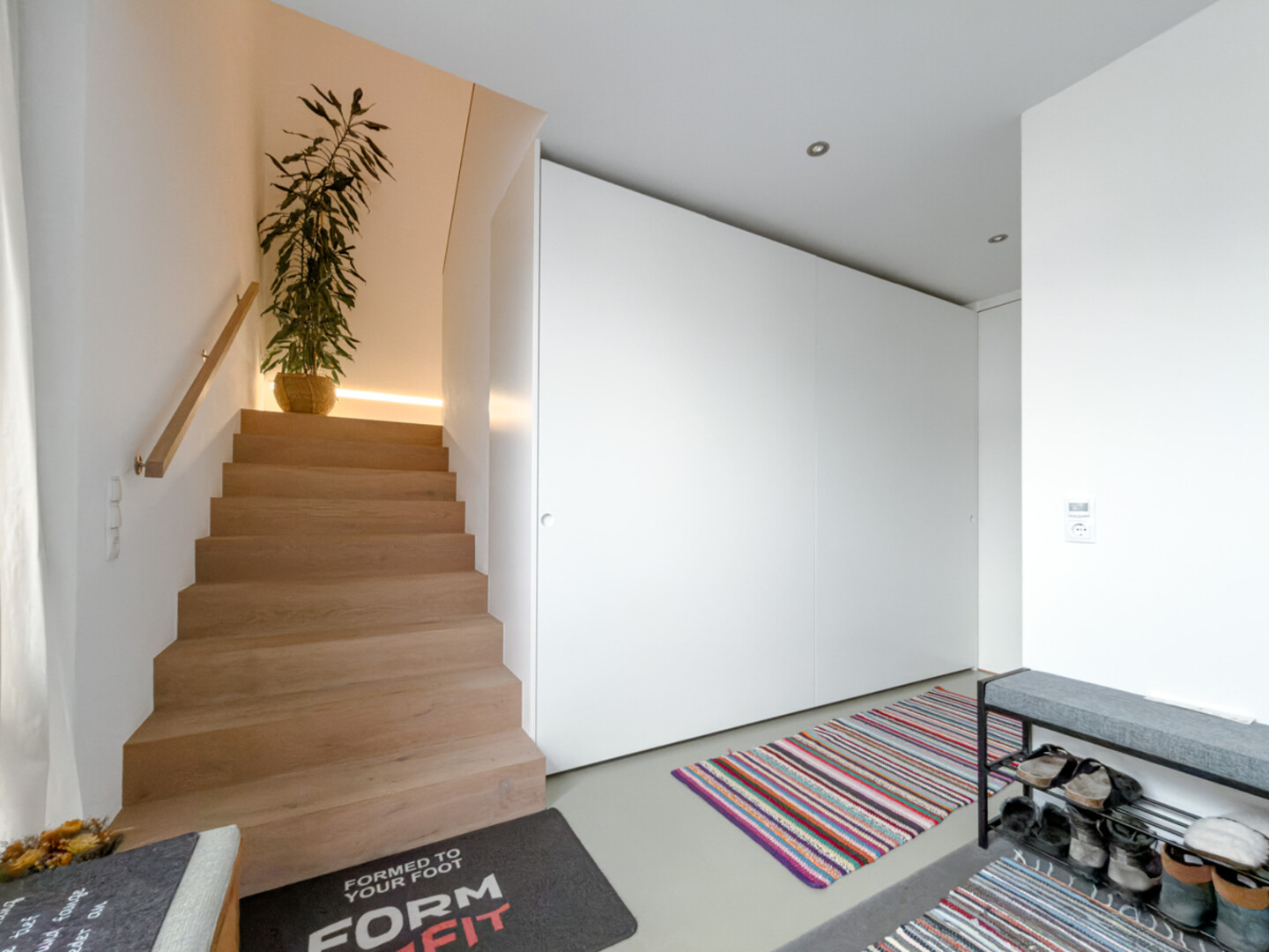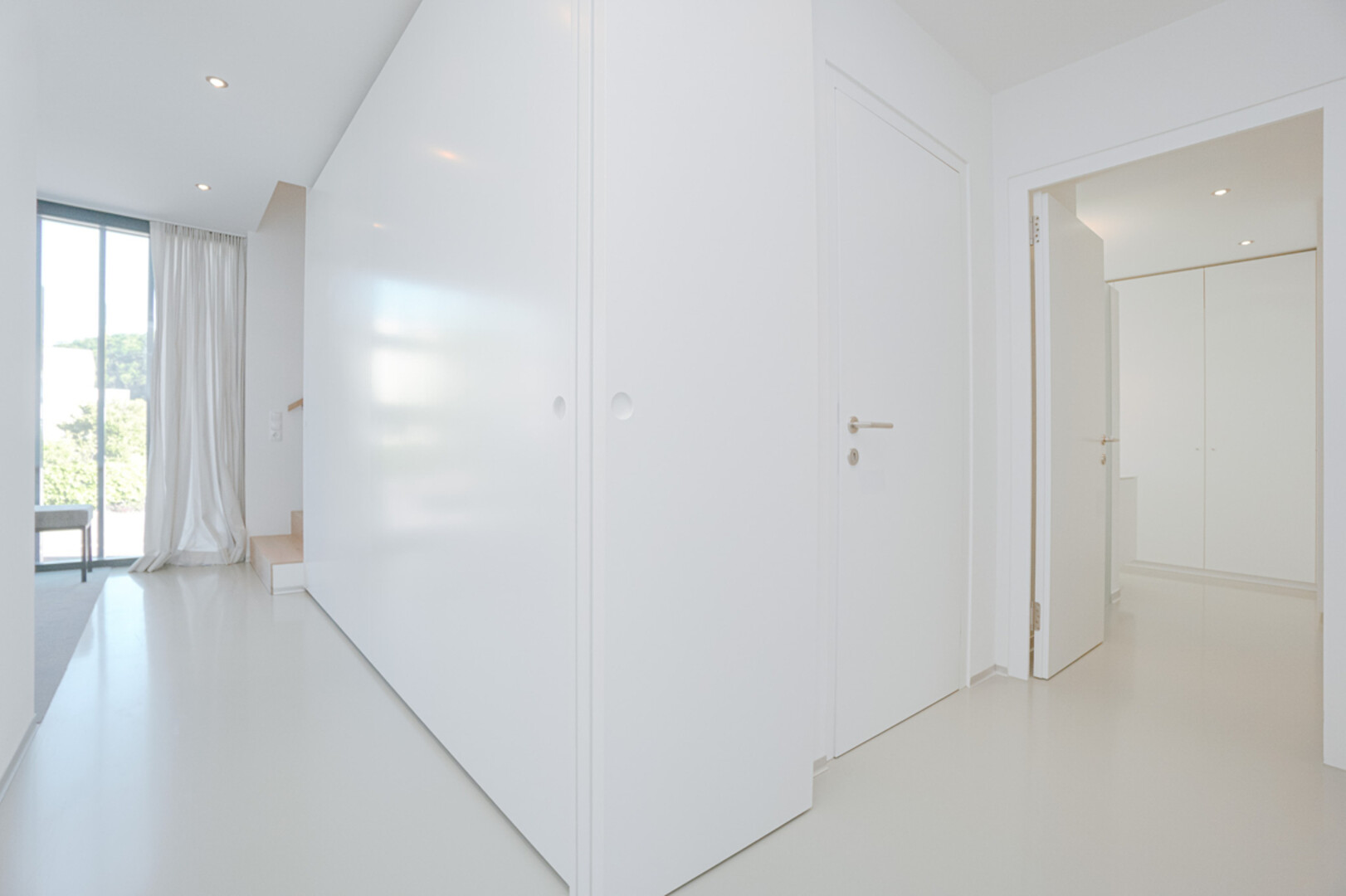 Der edle Eichenparkettboden, weiß geölt, unterstreicht den modernen und zugleich warmen Charakter der Immobilie. Für optimalen Sonnenschutz sorgen elektrisch betriebene Lamellenraffstores.