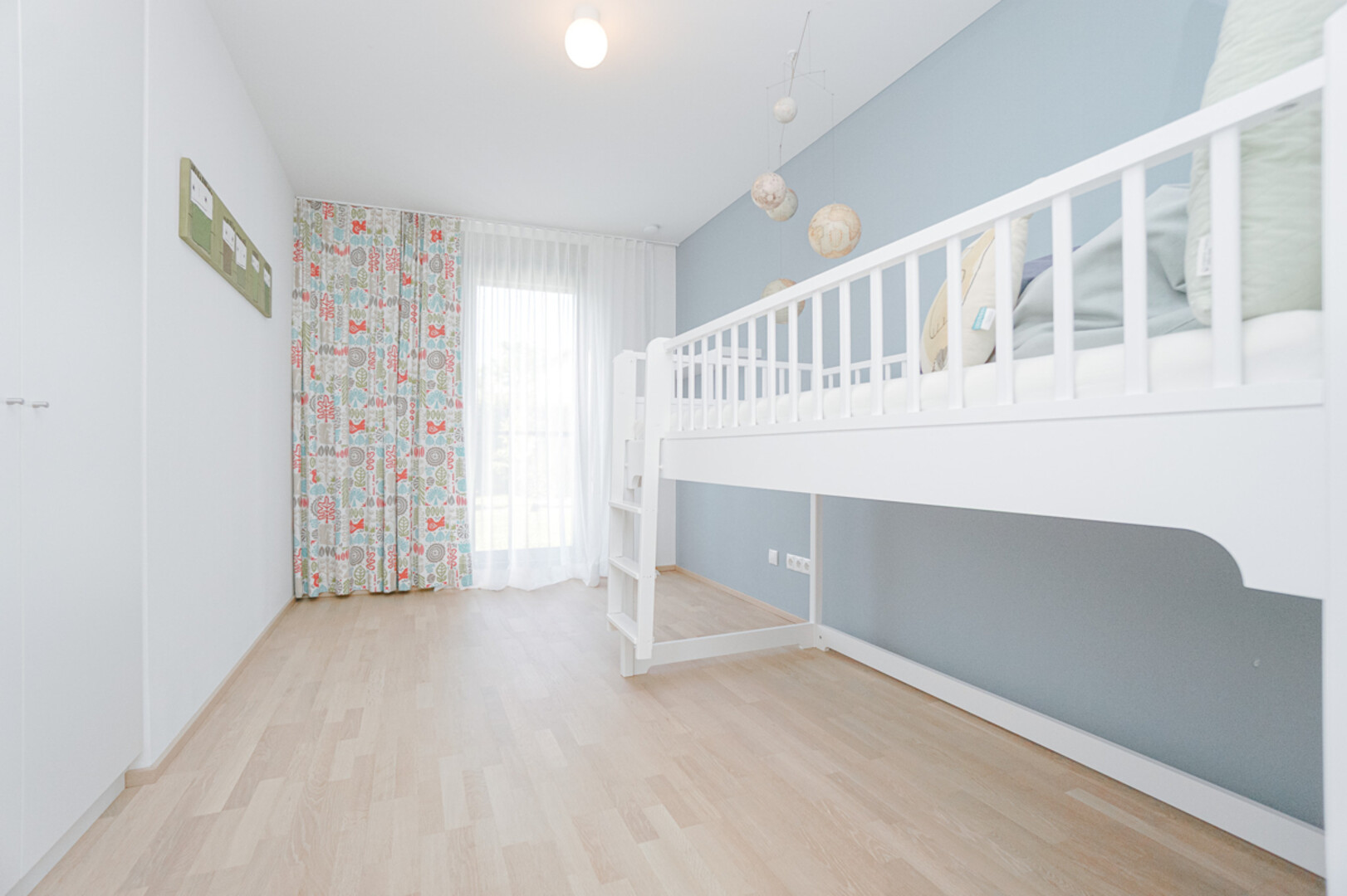 Auf einer Wohnnutzfläche von rund 150 m² verteilen sich vier großzügige Schlafzimmer sowie zwei modern ausgestattete Badezimmer. Die lichtdurchfluteten Räume schaffen eine angenehme Wohnatmosphäre und bieten dank der hochwertigen Holz-Alu-Fenster mit 3-fach-Verglasung gute Energieeffizienz und Wohnqualität. In allen Schlaf- und Badezimmern sowie bei der Hebeschiebetüre zur Terrasse sind Insektenschutzgitter installiert, was den Wohnkomfort zusätzlich erhöht.