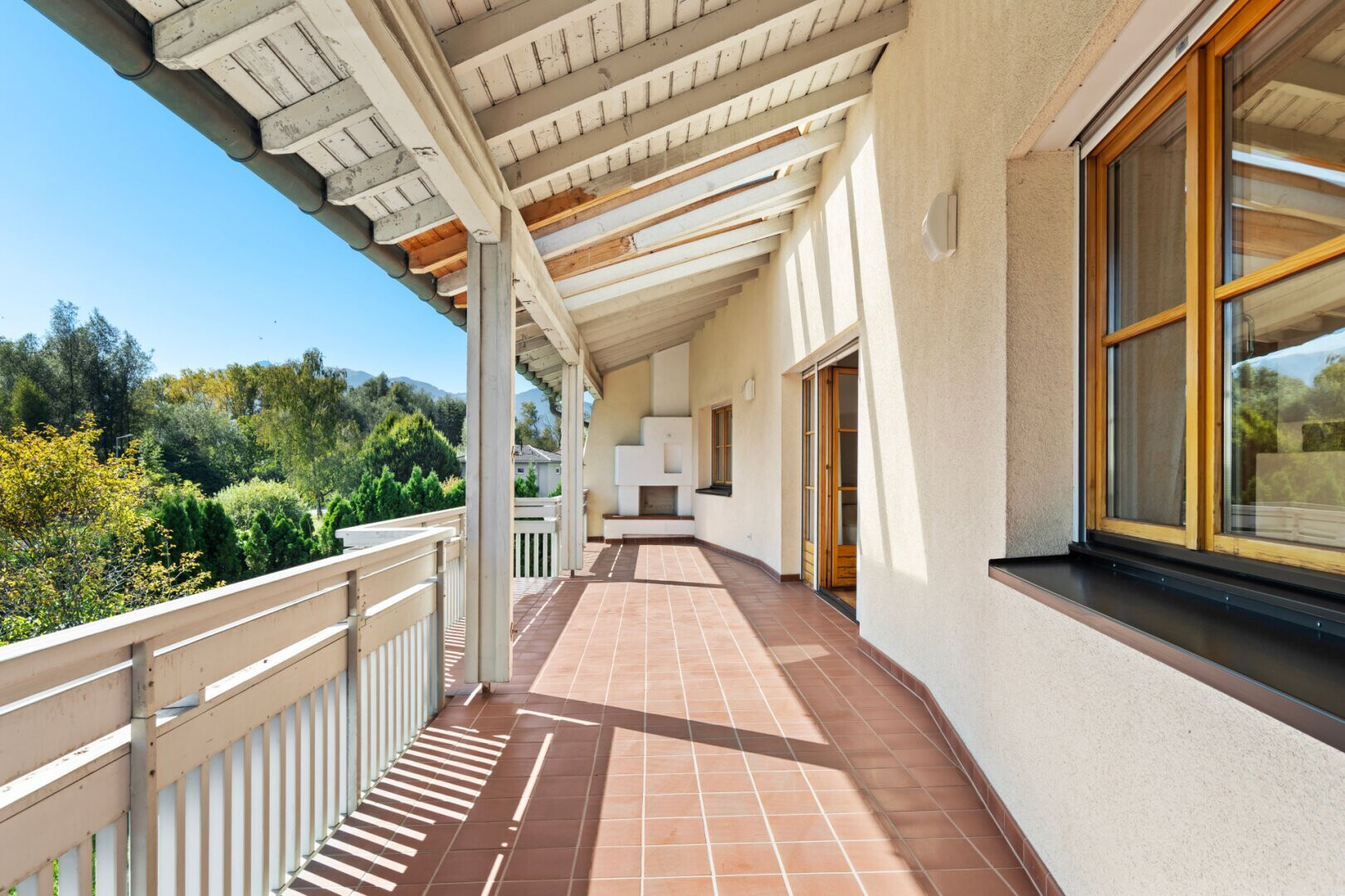 Ein besonderes Highlight ist die große Panorama-Terrasse mit Außenofen – ideal für gesellige Abende oder entspannte Stunden mit Blick in die Weite des Koblacher Rieds.