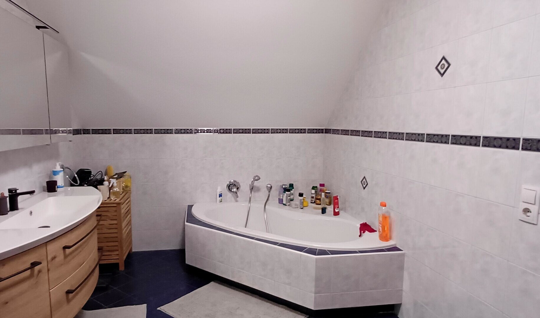 Badezimmer mit Badewanne und Dusche sowie einem neuwetrigen Badverbau