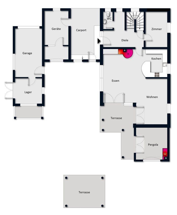 — geschlossene Pergola mit Grillstelle und überdachte Sitzgelegenheit