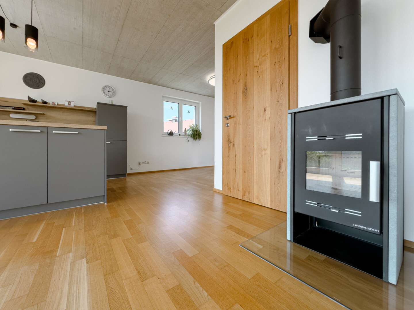 Das im Jahr 2019 errichtete Haus besticht durch moderne, geradlinige Architektur in Massivbauweise und eine hohe Bauqualität. Geschliffene Sichtbetondecken -und Treppe, dreifach verglaste Alu-Kunststoff-Isolierfenster und maßgefertigte Holztüren unterstreichen den hochwertigen Charakter der Immobilie. Die Wohnnutzfläche von insgesamt ca. 124,57 m² verteilt sich auf drei Ebenen – ideal für Familien oder auch als Zweigenerationenhaus nutzbar.