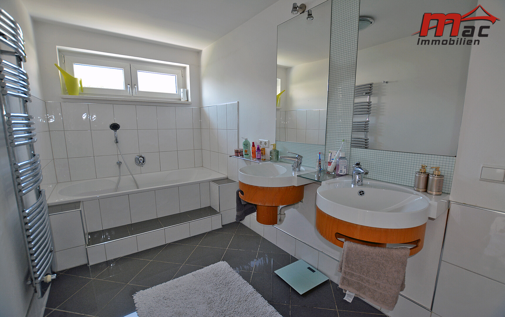 Zwei Tageslichtbäder mit Dusche, Badewanne, Waschtisch mit Verbau, Privat-WC und Wäscheabwurf sowie ein separates Gäste-WC im Erdgeschoss bieten praktischen Komfort für Familien oder Gäste.