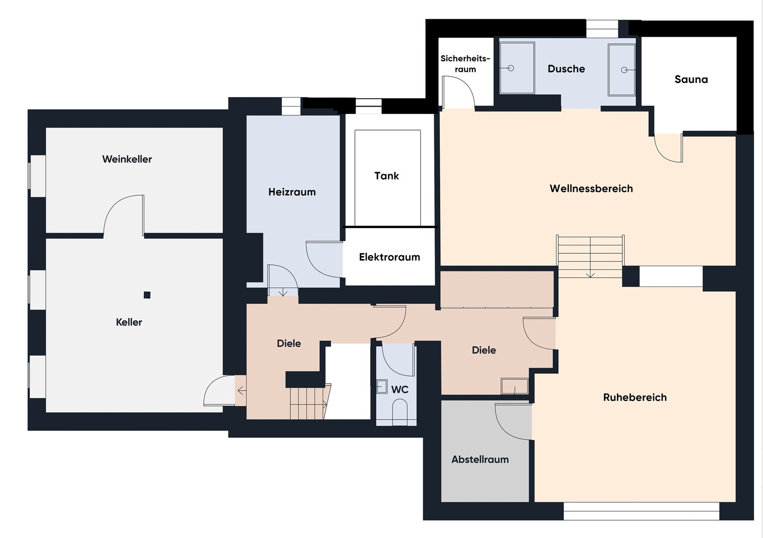 Besonderes Highlight ist der großzügige Wellnessbereich mit ca. 87 m², der Wellness und Erholung auf höchstem Niveau verspricht. Hier lassen sich Ruhe und Entspannung in den eigenen vier Wänden genießen – ein wahres Refugium vom Alltag.