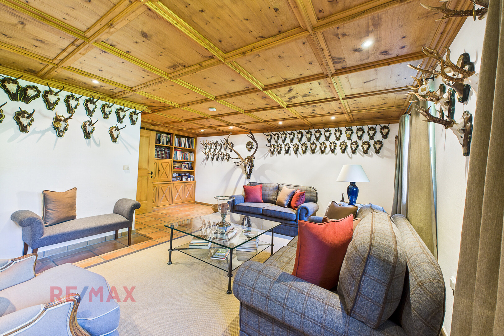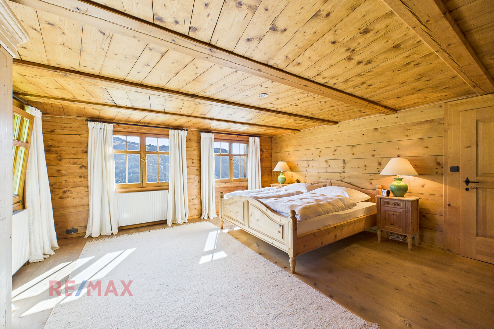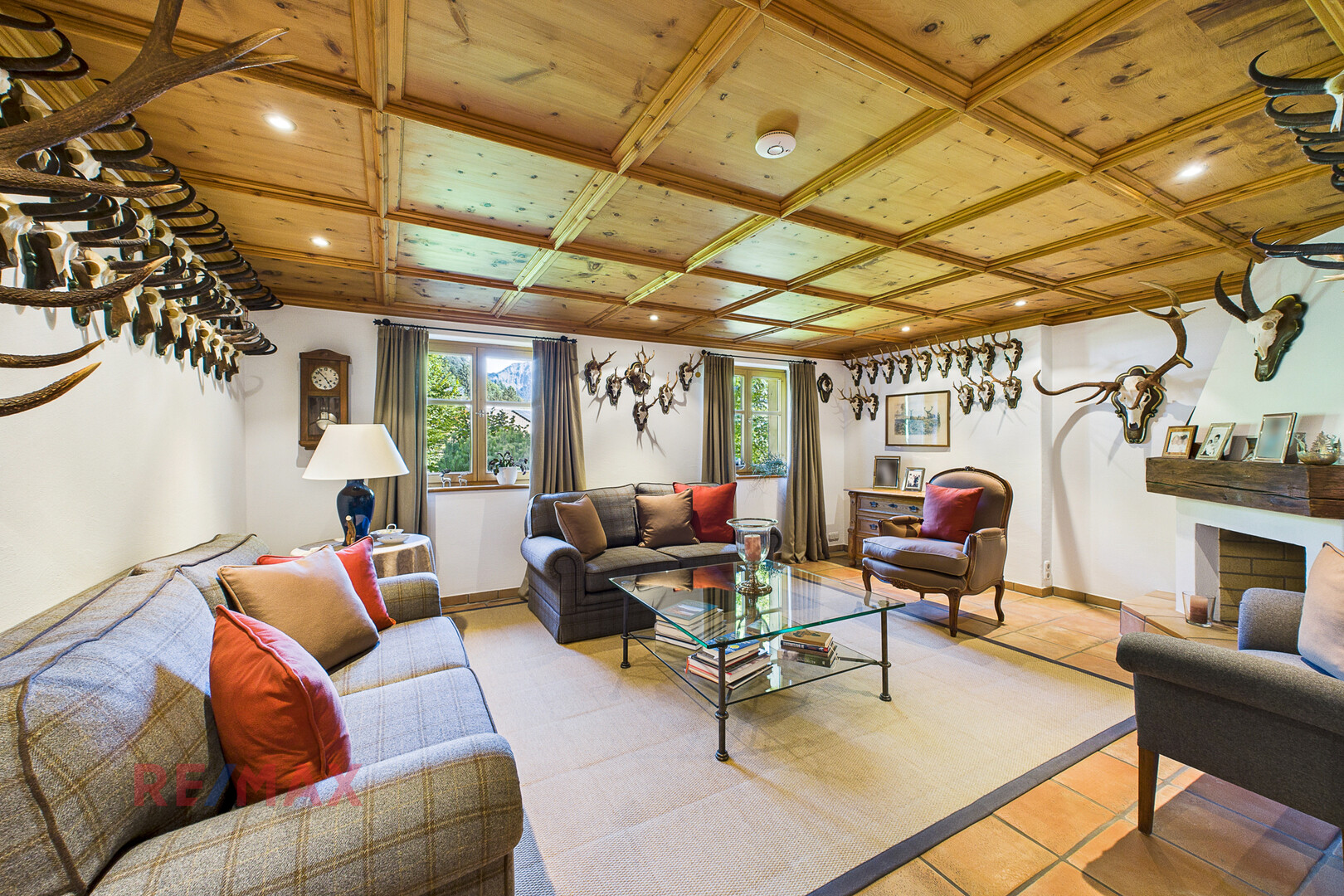 Fünf helle Schlafzimmer und vier stilvolle Bäder sorgen für Rückzugsorte mit höchstem Wohlfühlfaktor. Der Essbereich begeistert mit einem traditionellen Kachelofen samt gemütlicher Ofenbank – ein Ort, an dem man gerne lange Abende im Kreis der Familie und Freunden verbringt. Im angrenzenden Wohnbereich unterstreicht der offene Kamin den behaglichen Charakter des Hauses und lädt zu entspannten Stunden am Feuer ein.