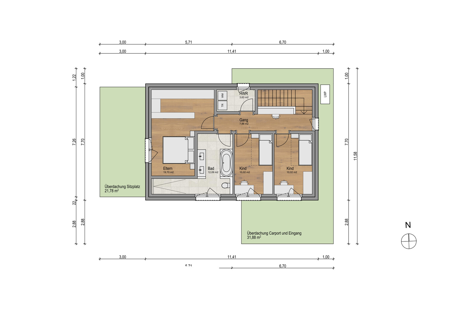 - Privatsphäre im Obergeschoss: Elternbereich mit Ankleide, zwei gleich große Kinderzimmer, ein modernes Badezimmer mit begehbarer Dusche sowie ein praktischer Schreibtischplatz im Flur.