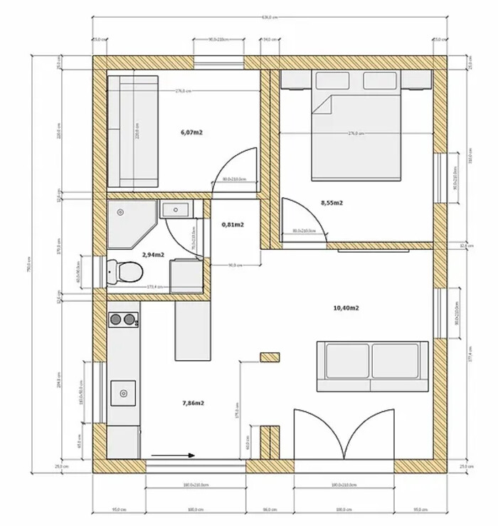 ◦ Struktur aus Holz mit Mineralwolldämmung 200 mm