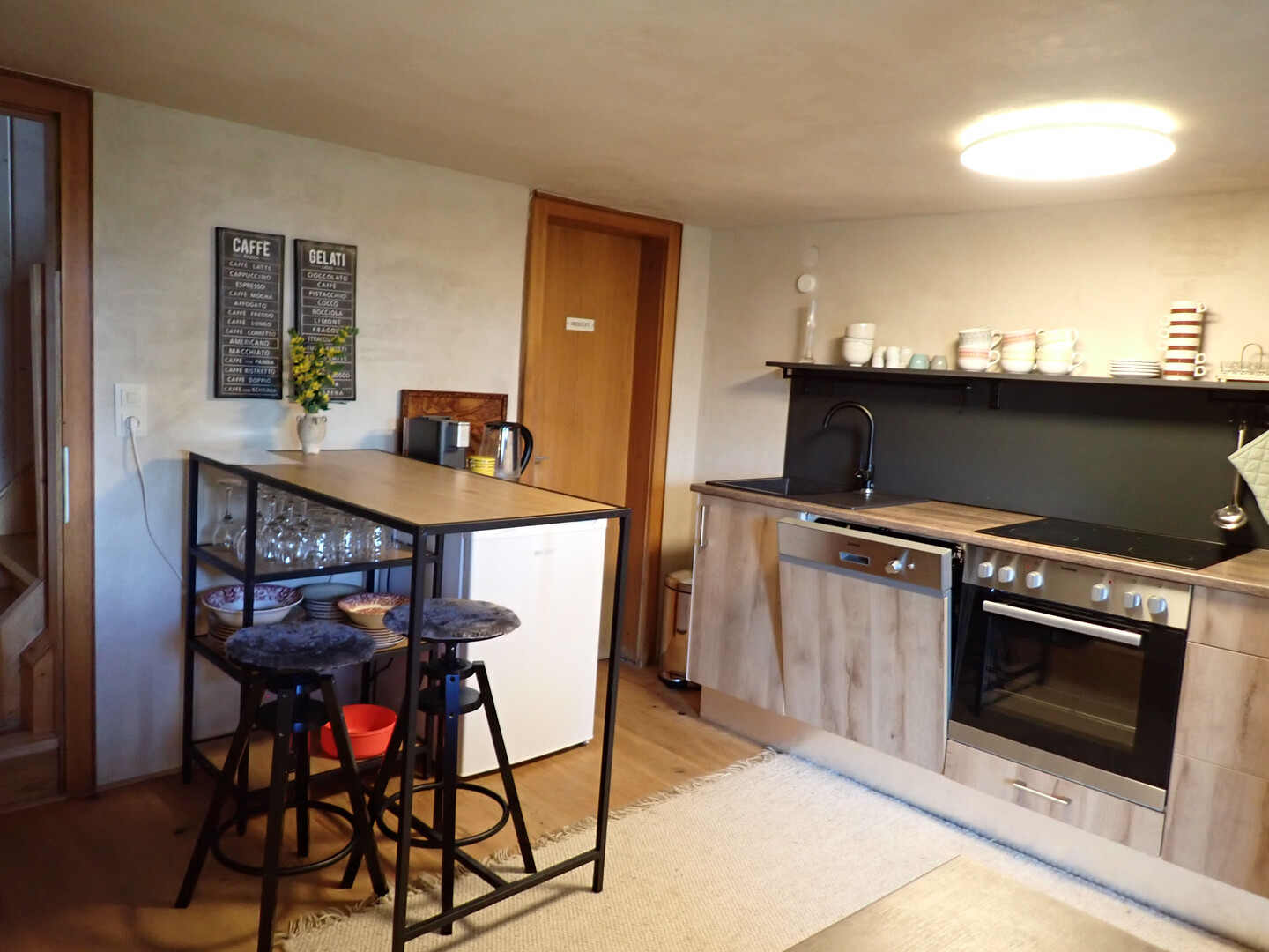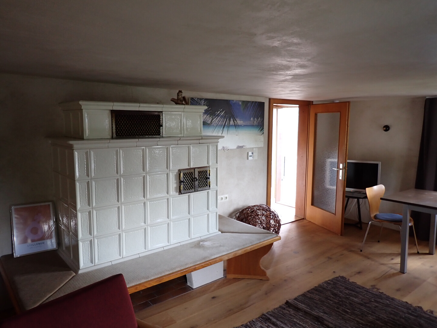 Im Erdgeschoß ist eine neuwertige Küche, ein Wohnzimmer mit einem mit Kacheln ummauerter Grundofen, Badezimmer und Waschküche. Im Obergeschoß sind drei Schlafzimmer.
