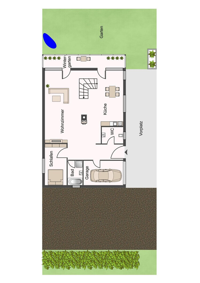 Die offene, loftähnliche Architektur verleiht dem Wohnhaus ein modernes und zugleich einladendes Ambiente. Großzügige Glasflächen lassen viel Tageslicht in die Räume und schaffen eine harmonische Verbindung zwischen Innen- und Außenbereich. Der nach Süden ausgerichtete Wintergarten erweitert den Wohnraum auf elegante Weise und bietet ganzjährig einen lichtdurchfluteten Rückzugsort mit Blick ins Grüne.